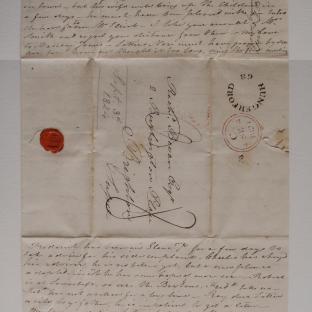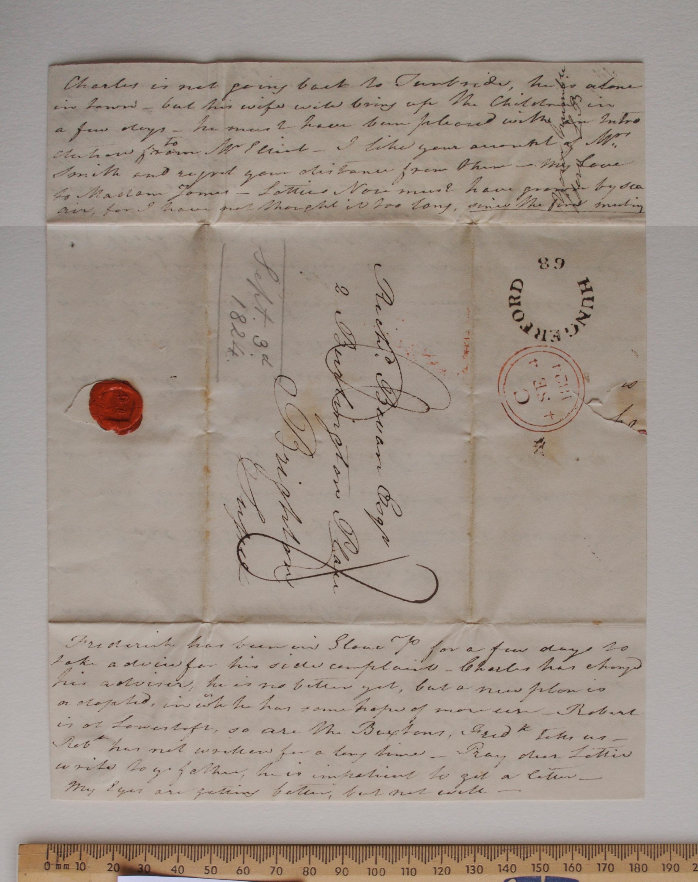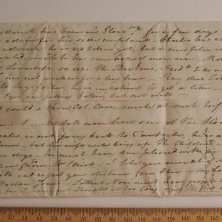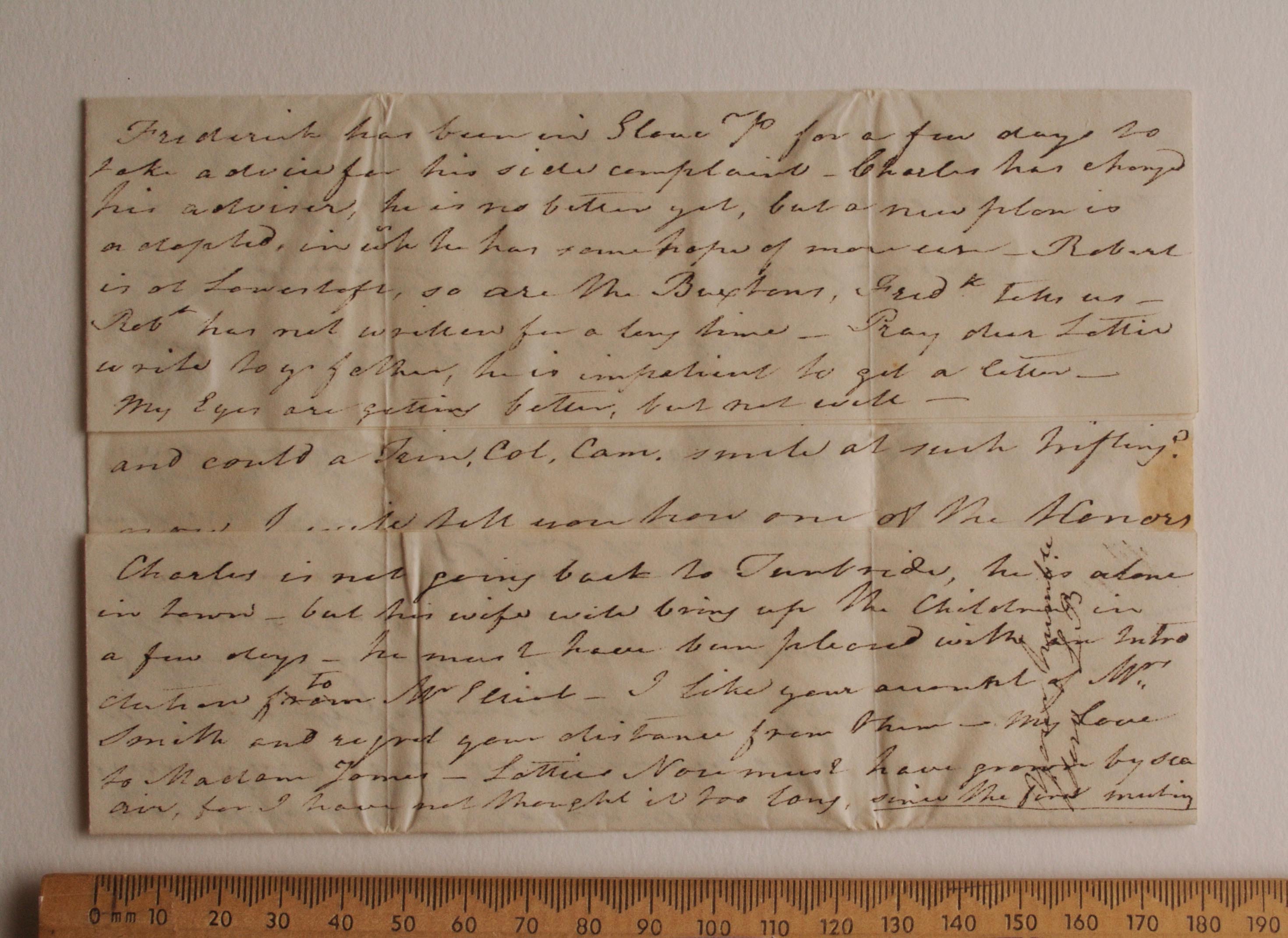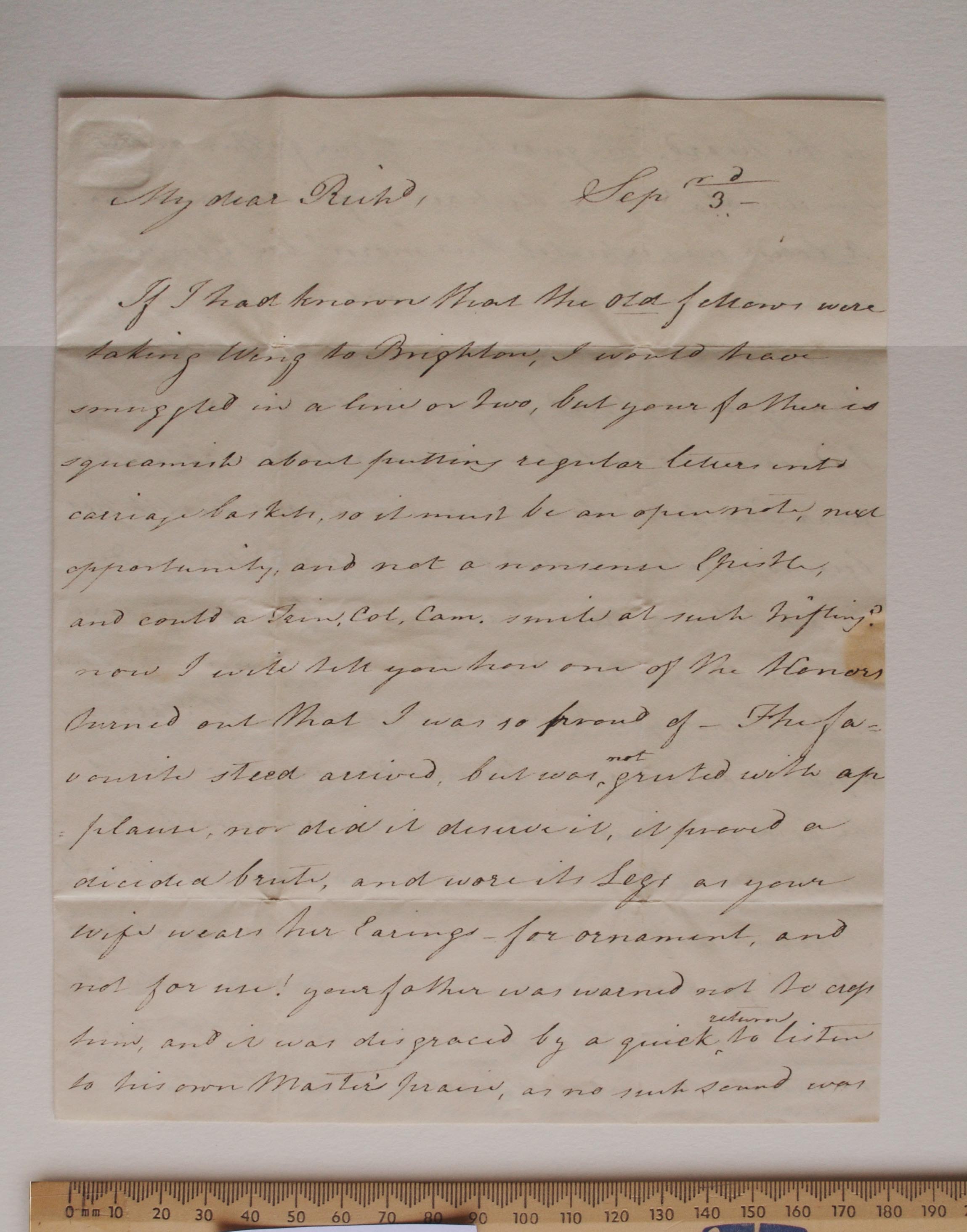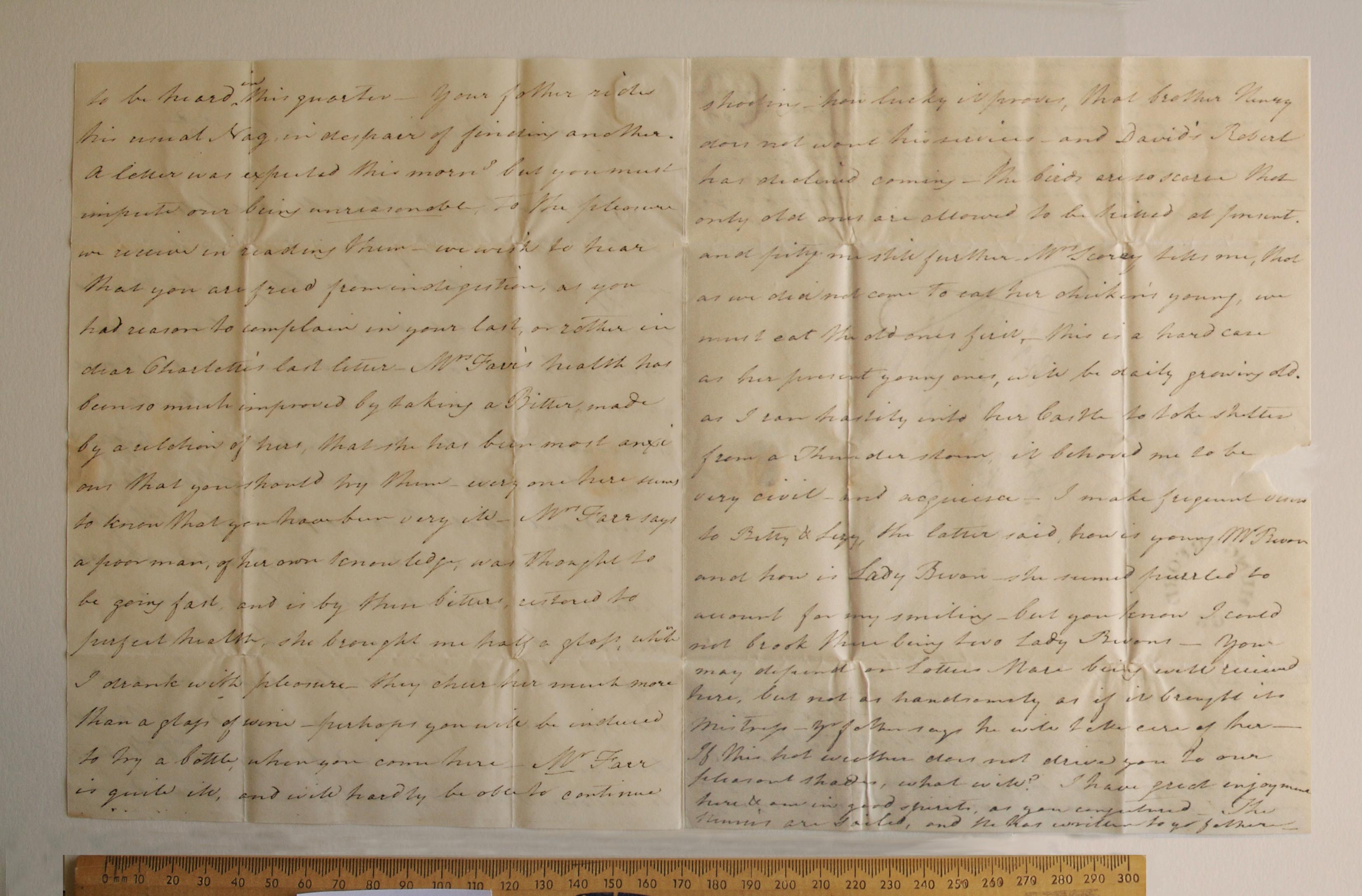 If I had known that the old fellows were taking wing to Brighton, I would have smuggled in a line or two, but your father is squeamish about putting regular letters into carriage baskets, so it must be an open note, next opportunity, and not a nonsense Epistle, and could a Trin, Col, Cam. smile at such trifling? Now I will tell you how one of the Horses turned out that I was so proud of - The favourite steed arrived, but was not greeted with applause, nor did it deserve it, it proved a decided brute, and wore its Legs as your wife wears her Earrings - for ornament, and not for use! Your father was warned not to cross him, and it was disgraced by a quick return to listen to his own Master's praise as no such sound was to be heard in this quarter - Your father rides his usual Nag, in despair of finding another. A letter was expected this morning but you must impute our being unreasonable, to the pleasure we receive in reading them - we wish to hear that you are freed from indigestion, as you had reason to complain in your last, or rather in dear Charlotte's last letter - Mrs Farr's health has been so much improved by taking a Bitter, made by a relation of hers, that she has been most anxious that you should try them - every one here seems to know that you have been very ill - Mrs Farr says a poor man, of her own knowledge, was thought to be going fast, and is by these bitters, restored to perfect health, she brought me half a glass, which I drank with pleasure - they cheer her much more than a glass of wine - perhaps you will be induced to try a bottle, when you come here - Mr Farr is quite ill, and will hardly be able to continue shooting - how lucky it proves, that brother Henry does not want his services - and David's Robert has Declined coming - the birds are so scarce that only old ones are allowed to be killed at present. and pity me still further. Mrs Scorey tells me, that as we did not come to eat her chicken's young, we must eat the old ones first - this is a hard case as her present young ones, will be daily growing old. as I ran hastily into her Castle to take shelter from a Thunder storm, it behoved me to be very civil - and acquiesce - I make frequent visits to Betty & Lizy [sic], the latter said, how is young Mr Bevan and how is Lady Bevan - she seemed puzzled to account for my smiling - but you know I could not brook there being two Lady Bevans - You may depend on Lotties Mare being well received here, but not as handsomely as if it brought its Mistress - Yr father says he will take care of her - If this hot weather does not drive you to our pleasant shades, what will? I have great enjoyment here & am in good spirits, as you conjectured - The H[-] are sailed, and he has written to yr father - Charles is not going back to Tunbride [sic], he is alone in town- but his wife will bring up the children in a few days - he must have been pleased with an Introduction (from – crossed out) to Mr. Elliot - I like your account of Mrs Smith and regret your distance from them - my love to Madam James - Lotties Nose must have grown by sea air, for I have not thought it too long since the first meeting. Frederick has been in Glouc P [Gloucester Place] for a few days to take advice for his side complaint - Charles has changed his adviser, he is no better yet, but a new plan is adopted in wh he has some hope of more ease - Robert is at Lowestoft, so are the Buxtons, Fredk tells us - Robt has not written for a long time - Pray dear Lottie write to yr father, he is impatient to get a letter - My eyes are getting better, but not well -