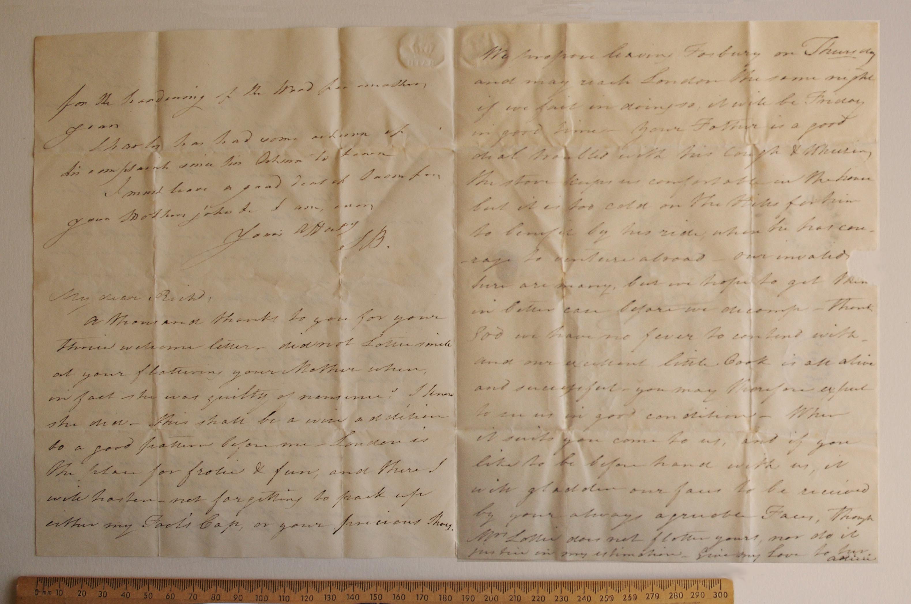 A thousand thanks to you for your thrice welcome letter- did not Lottie smile at your flattering your Mother when, in fact she was guilty of nonsense? I know she did - this shall be a wise addition to a good pattern before me - London is the place for frolic & fun, and there I will hasten not forgetting to pack up either my Fool’s Cap, or your precious Thos.