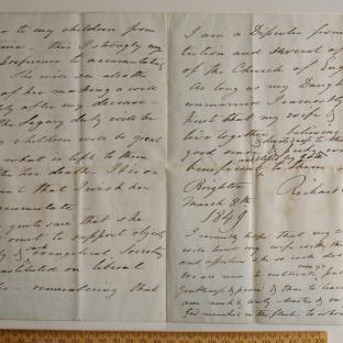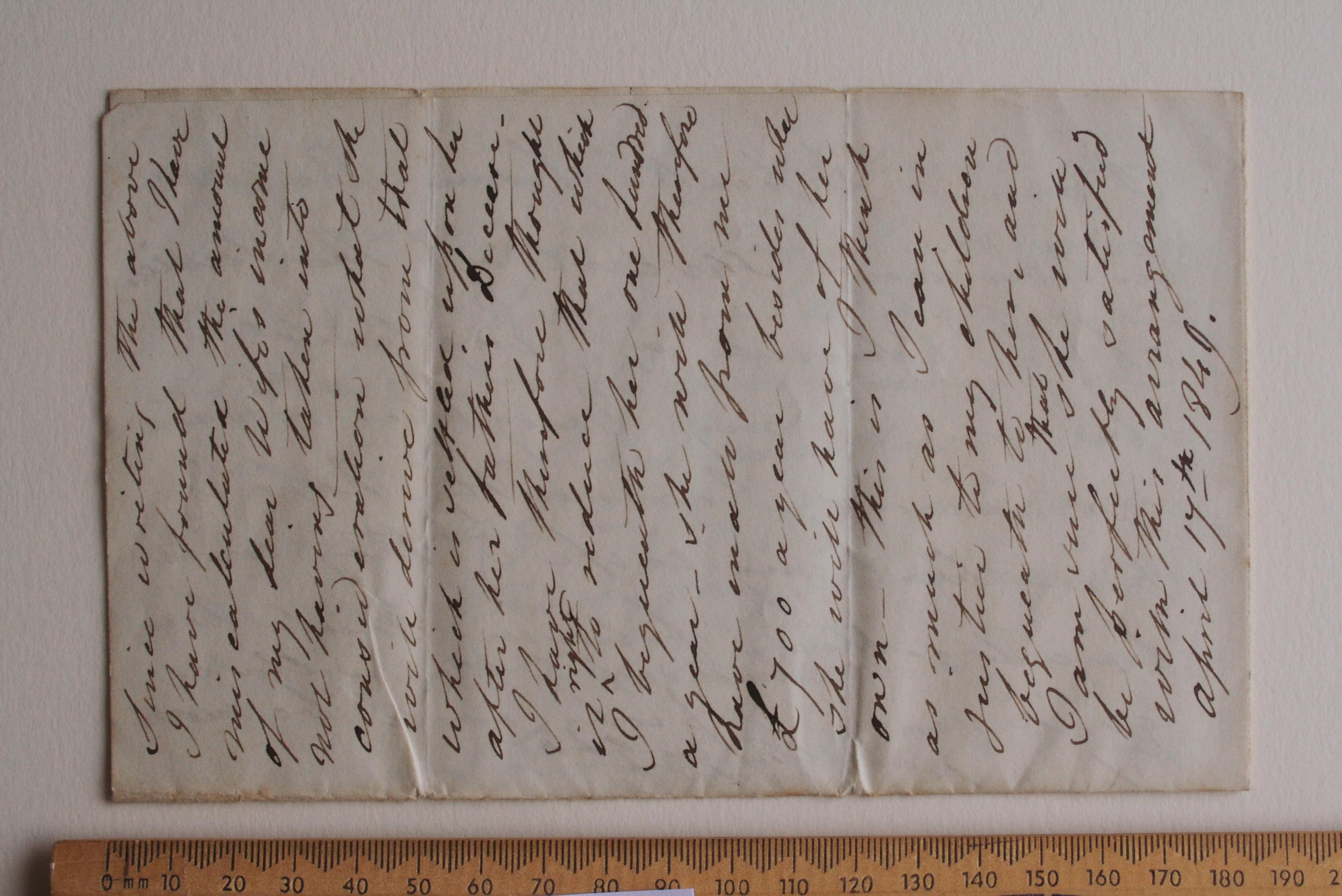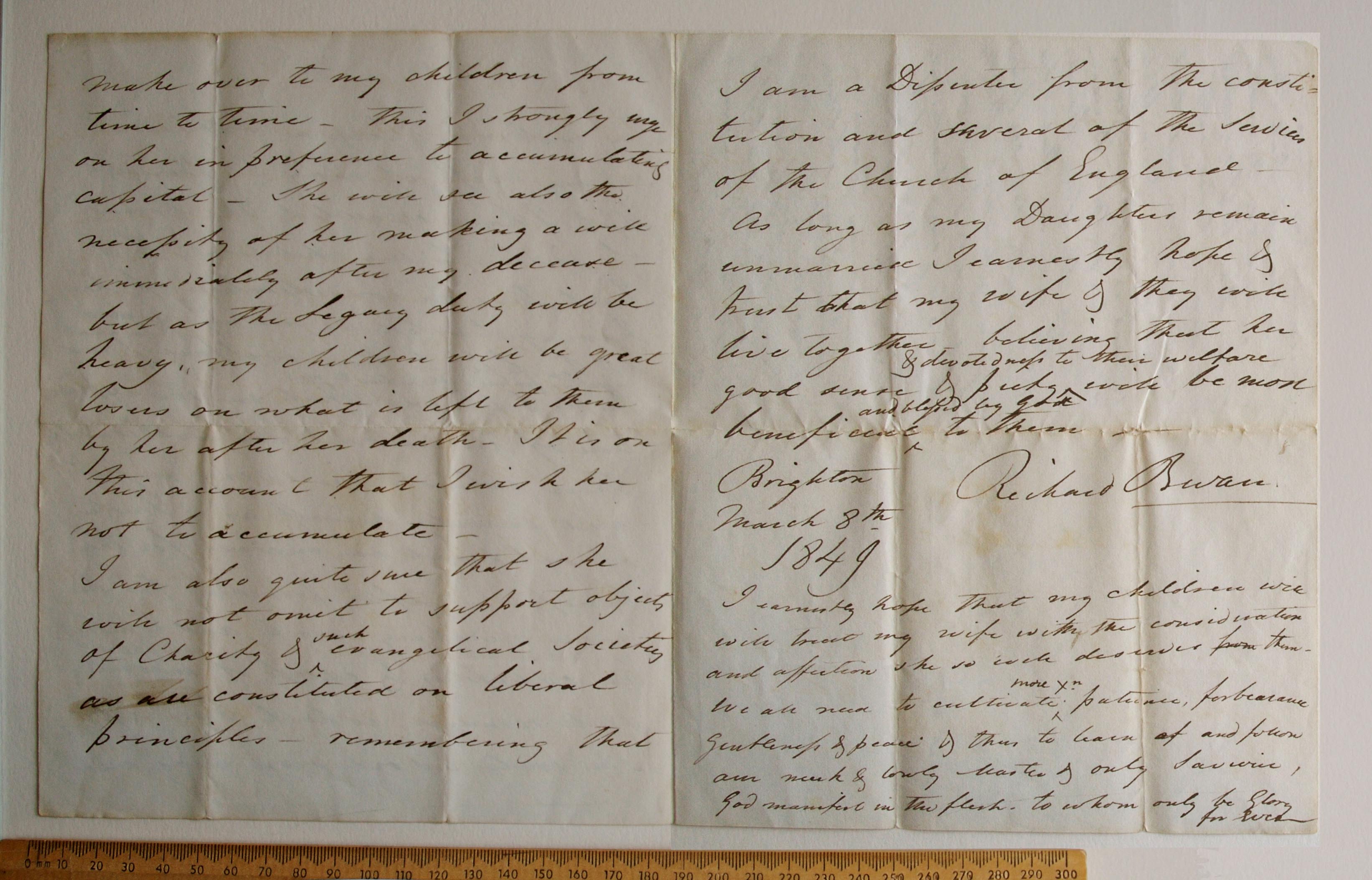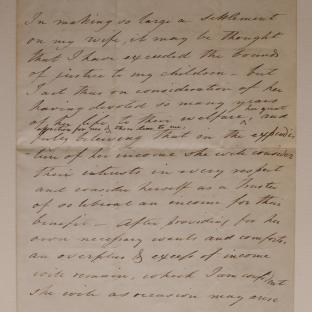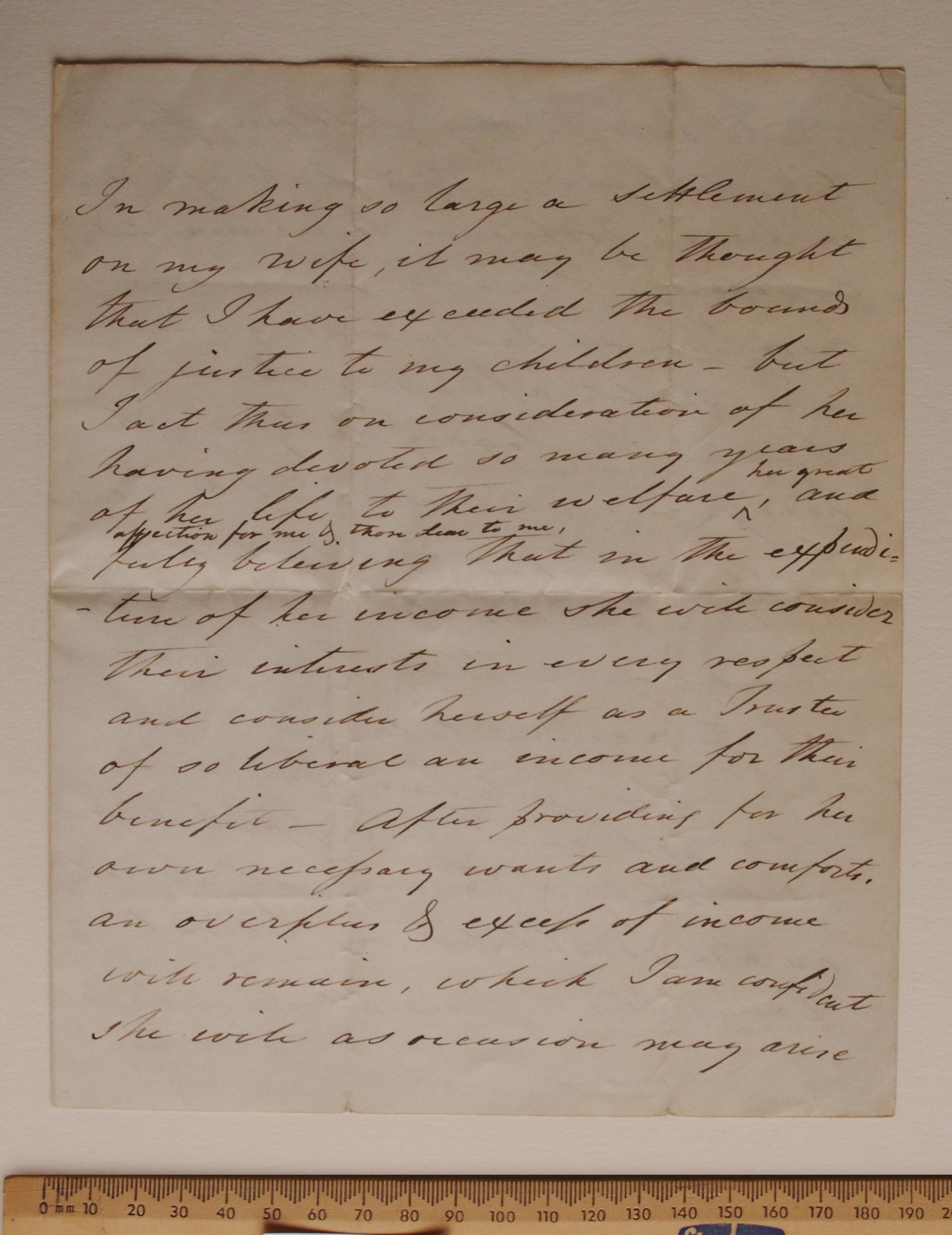 In making so large a settlement on my wife, it may be thought that I have exceeded the bounds of justice to my children - but I act thus on consideration of her having devoted so many years of her life to their welfare ^her great affection for me & those dear to me, and fully believing that in the expenditure of her income she will consider their interests in every respect and consider herself as a trustee of so liberal an income for their benefit - After providing for her own necessary wants and comforts an overplus [sic] & excess of income will remain, which I am confident she will as occasion may arise make over to my children from time to time - This I strongly urge on her in preference to accumulating capital - She will see also the necessity of her making a will immediately after my decease - but as the legacy duty will be heavy, my children will be great losers on what is left to them by her after her death - it is on this account that that I wish her not to accumulate.