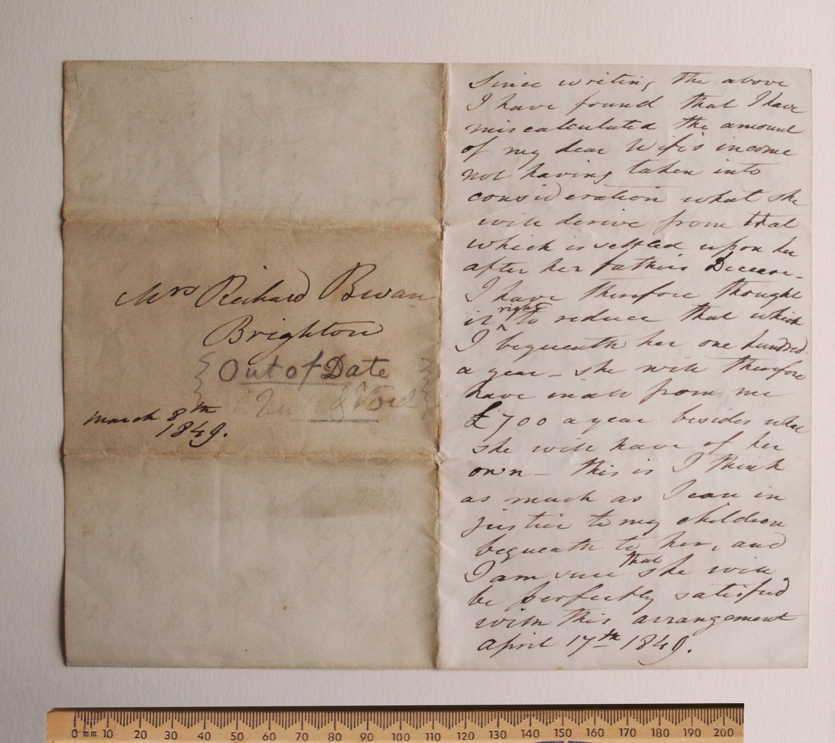 Since writing the above I have found that I have miscalculated the amount of my dear wife’s income not having taken into consideration what she will derive from that which is settled upon her after her fathers Decease - I have therefore thought it right to reduce that which I bequeath her one hundred a year - she will therefore have made from me £700 a year besides what she will have of her own - this is I think as much as I can in justice to my children bequeath to her, and I am sure ^that she will be perfectly satisfied with this arrangement
