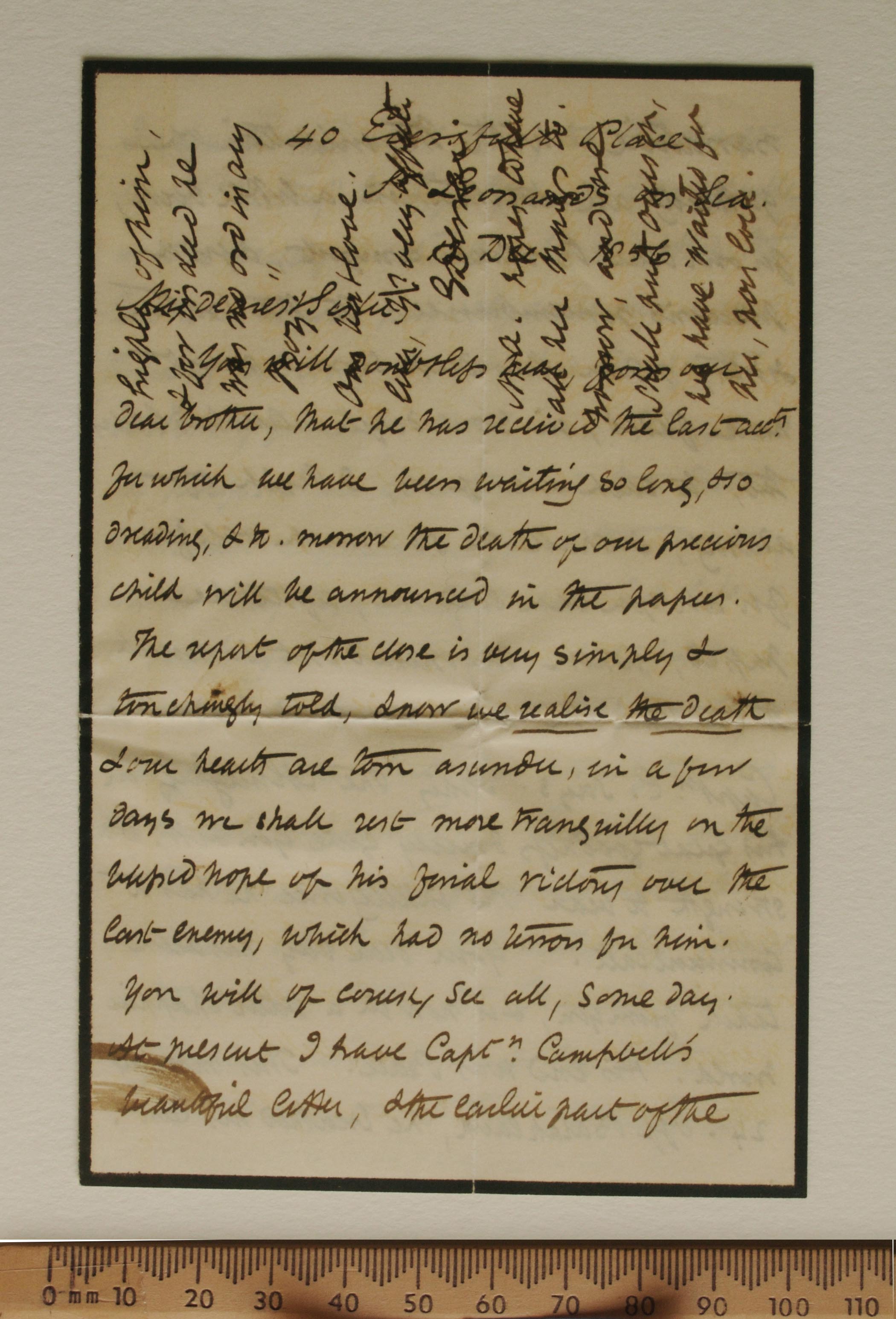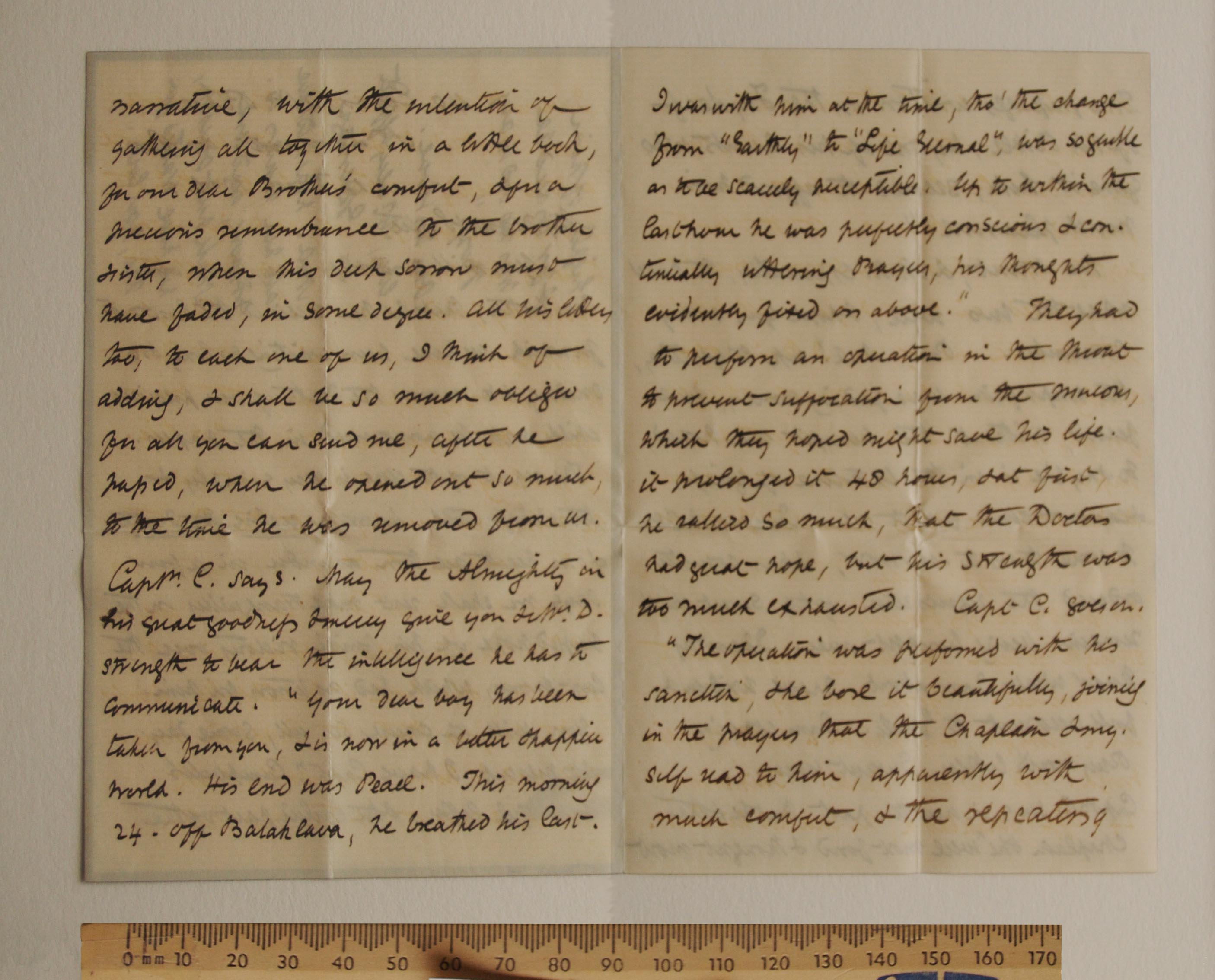 You will doubtless hear from our dear brother, that he has received the last acct for which we have been waiting so long, and so dreading, & to-morrow the death of our precious child will be announced in the papers. The report of the close is very simply & touchingly told & now we realise the death & our hearts are torn asunder, in a few days we shall rest more tranquilly on the blessed hope of his final victory over the last enemy, which had no terrors for him. You will of course see all, some day. At present I have Captn Campbell’s beautiful letter, & the earlier part of the narrative, with the intention of gathering all together in a little book, for our dear Brother’s comfort, & for a precious remembrance to the brother sister [sic], when this deep sorrow must have faded, in some degree. All his letters too, to each one of us, I think of adding, & shall be so much obliged for all you can send me, after he passed, when he opened out so much, to the time he was removed from us. Capt. C says may the Almighty in His great goodness & mercy give you and Mr. D strength to hear the intelligence he has to communicate “your dear boy has been taken from you, & is now in a better and happier world. His end was Peace. This morning 24. off Balaklava, he breathed his last. I was with him at the time, tho’ the change from “Earthly” to “Life Eternal” was so gentle as to be scarcely perceptible. Up to within the last hour he was perfectly conscious & continually uttering prayers, his thoughts evidently fixed on above”. They had to perform an operation in the throat to prevent suffocation from the mucous, which they hoped might save his life. It prolonged it 48 hours, & at first, he rallied so much, that the doctors had great hope, but his strength was too much exhausted. Capt C goes on “The operation was performed with his sanction, & he bore it beautifully, joining in the prayers that the Chaplain & my good self said to him, apparently with much comfort, & the repeating two [sic] passages written on the fly leaf of his bible, by one his aunts who gave it him, seemed to afford him much pleasure”.