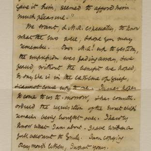 We want, & MA especially, to know what the two were, I hope you may remember. Poor M.A up to yesterday, the impression was fading away, & we feared [?], without the benefit we hoped, today she is in the extreme of grief & cannot come up to me. James hopes to come to us to-morrow & has counter ordered the requisition of the sweet child’s remains being brought over. I hardly know what I am about. I have written a full account to Emily. I am copying Raymond’s letters, I want yours.