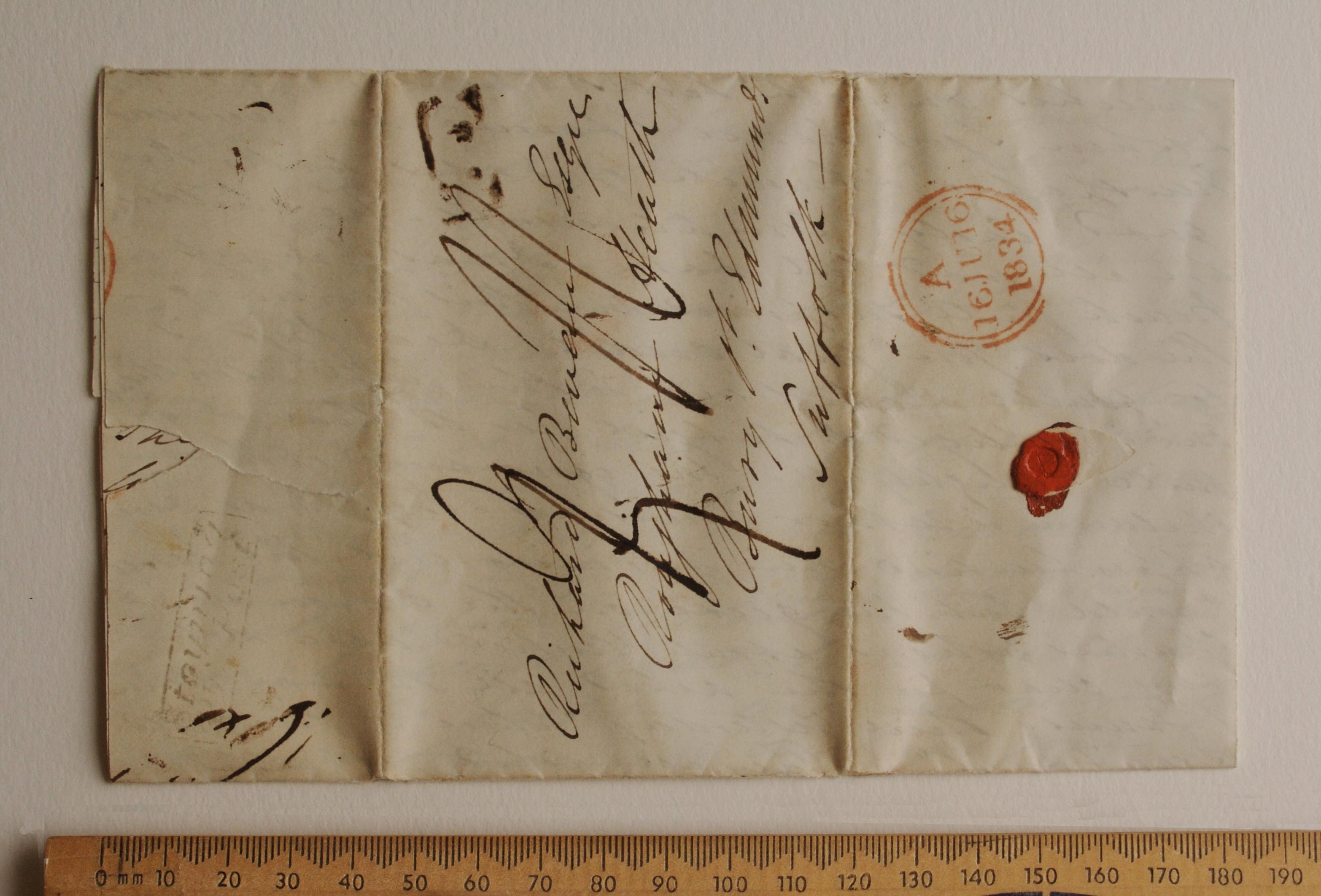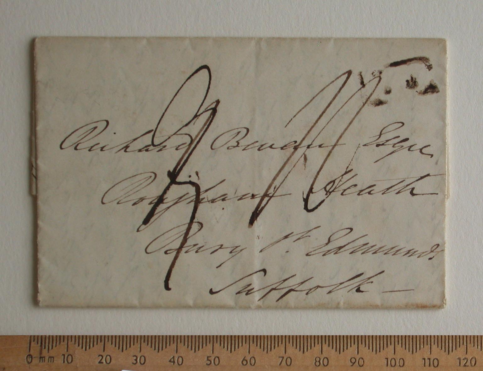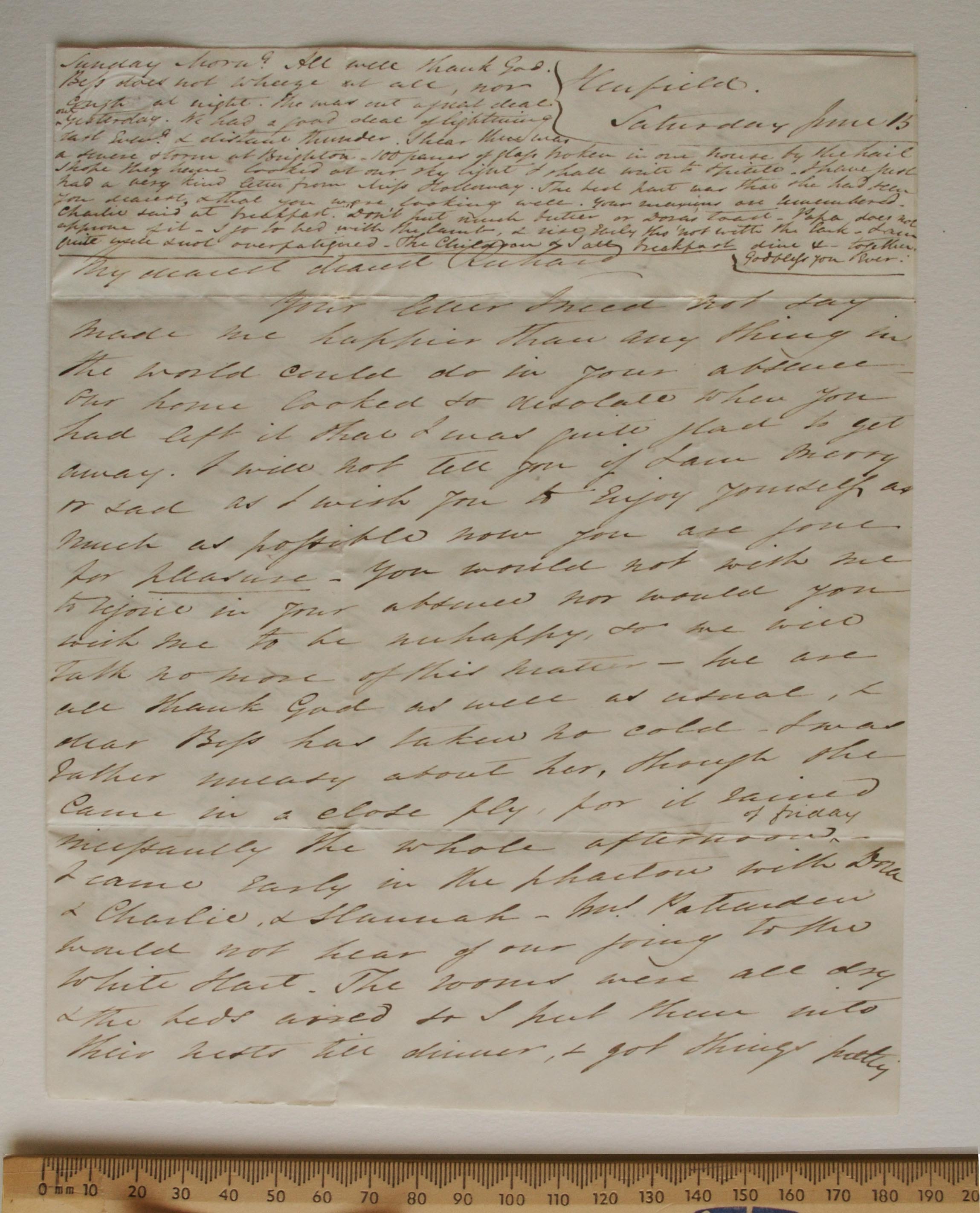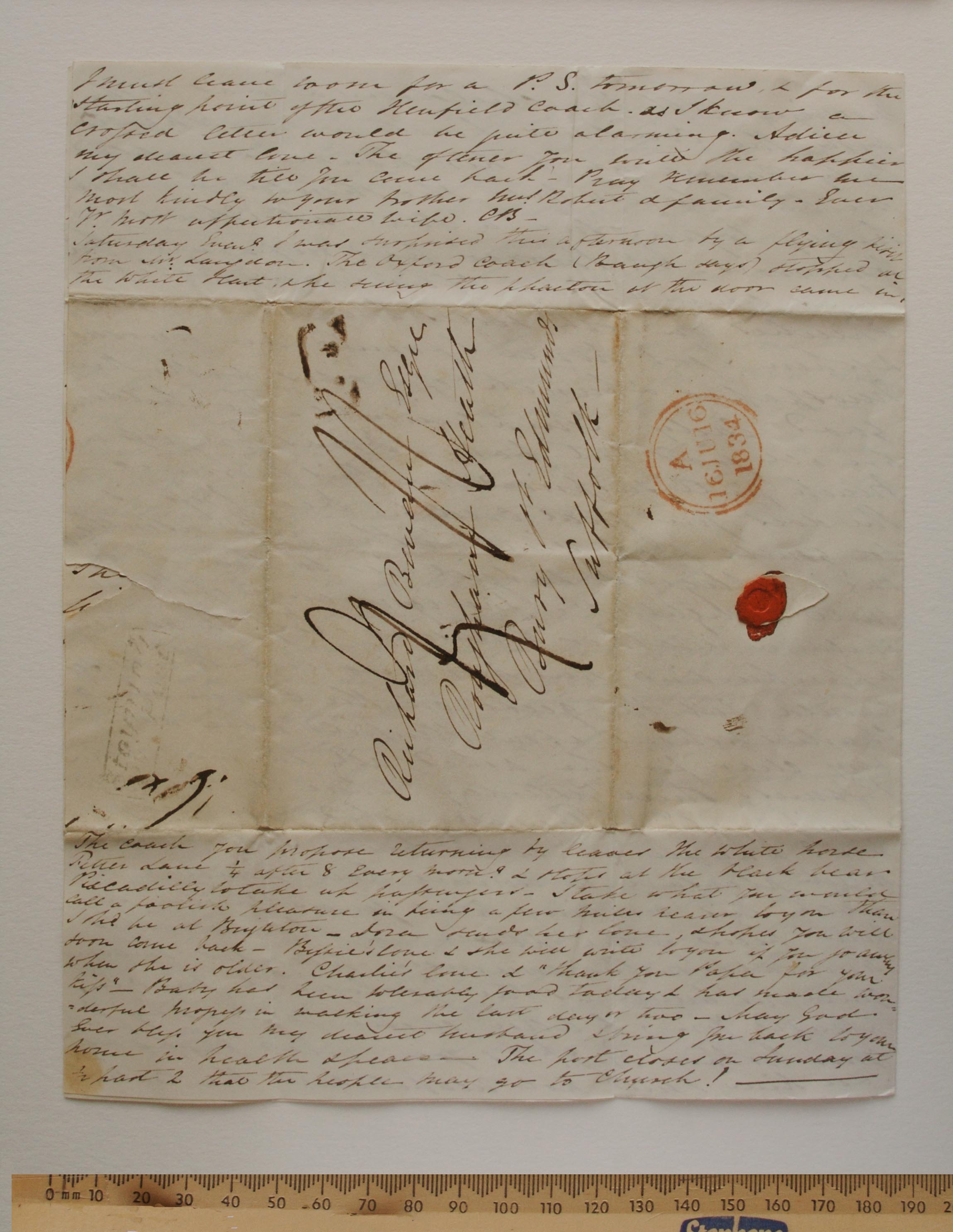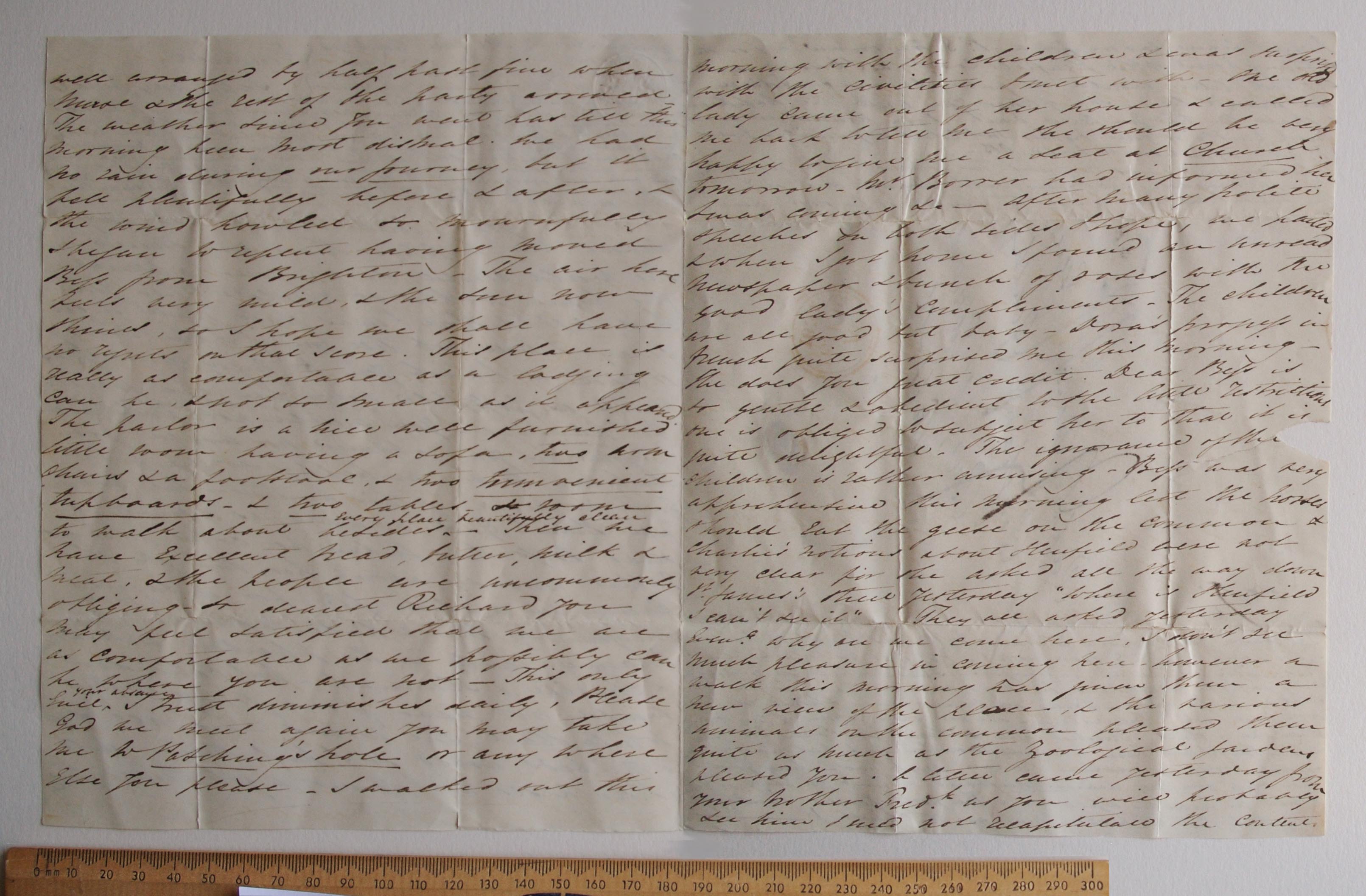Your letter I need not say made me happier than any thing in the world could do in your absence - Our home looked so desolate when you had left it that I was quite glad to get away. I will not tell you if I am merry or sad as I wish you to enjoy yourself as much as possible now you are gone for pleasure - you would not wish me to rejoice in your absence nor would you wish me to be unhappy, so we will talk no more of this matter - We are all Thank God as well as usual, & dear Bess has taken no cold- I was rather uneasy about her, though she came in a close fly, for it rained incessantly the whole afternoon of Friday- I came early in the phaeton with Dora and Charlie, and Hannah- Mrs Paterdew would not hear of our going to the White Hart. The rooms were all dry and the beds aired so I put them into their nests till dinner, and got things pretty well arranged by half past five when nurse and the rest of the party arrived. The weather since you went has till this morning been most dismal. We had no rain during our journey, but it fell plentifully before and after & the wind howled so mournfully I began to repent having moved Bess from Brighton. The air here feels very mild, and the sun now shines, so I hope we shall have no regrets on that score. This place is really as comfortable as a lodging can be, & not so small as it appeared. The parlour is a nice well furnished little room having a sofa, two arm chairs and a footstool, & two magnificent cupboards - & two tables & room to walk about besides, every place beautifully clean – [written in between the lines] - There we have excellent bread, further, milk and meat, & the people are uncommonly obliging - So dearest Richard you may feel satisfied that we are as comfortable as we hopefully can be where you are not – This only evil your absence I must dismiss daily, Please God we meet again you may take me to Patching’s hole or any where else you please - I walked out this morning with the children & was surprised with the civilities I met with - one old lady came out of her house & called me back to tell me she should be very happy to find me seat at church tomorrow - Mr Borrer had informed her I was coming etc - after many polite speeches on both sides I hope, we parted & when I got home I found an unread newspaper & bunch of roses with the good lady’s I compliments. The children are all good but baby - Dora’s progress in french quite surprised me this morning - she does you great credit. Dear Bess is so gentle & obedient to the little restrictions one is obliged to subject her to that it is quite delightful. The ignorance of the children is rather amusing - Bess was very apprehensive this morning lest the horses should eat the geese on the common & Charlie’s notions about Henfield were not very clear for she asked all the way down St James Street Yesterday “where is Henfield I can’t see it”. They all asked Yesterday even’g why are we come here, I don’t see much pleasure in coming here, however a walk this morning has given them a new view of the place & the various animals on the common pleased them quite as much as the Zoological Gardens pleased you. A letter came yesterday from your brother Fred’k. As you will probably see him I need not replicate the content. I must leave room for a ps tomorrow & for the starting point of the Henfield coach as I know a crossed letter would be quite alarming. Adieu my dearest love - The oftener you write the happier I shall be till you come back - Pray remember me most kindly to your brother Mrs Robert and family - Love Yr most affectionate wife CB