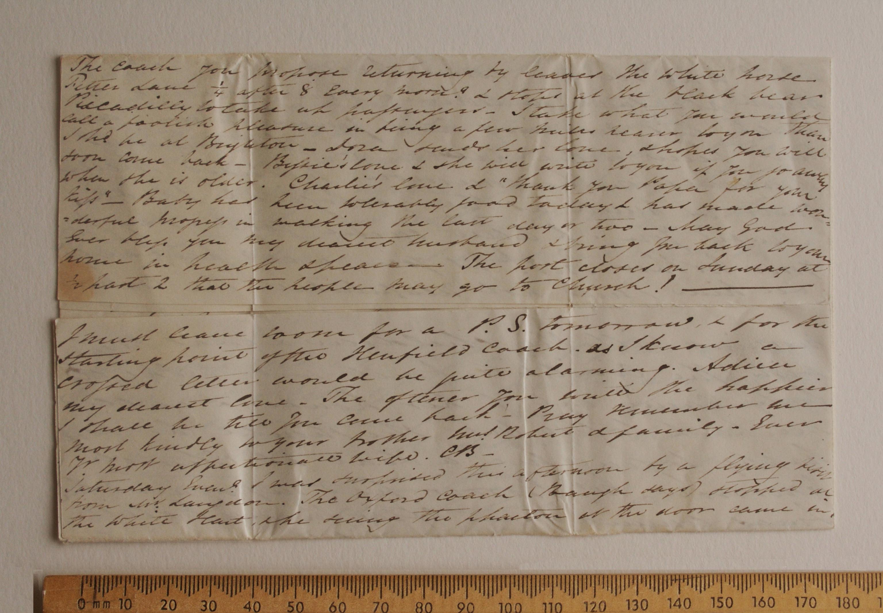 Saturday Eveng I was surprised this afternoon by a flying visit from Mr Langdon. The Oxford coach (Baugh says) stopped at the White Hart, and he seeing the phaeton at the door came in. The coach you propose returning by leaves the White Horse Peter Lane 1/4 after 8 every morning & stops at the Black Bear Picadilly to take up passengers - I take what you would call a foolish pleasure in being a few miles nearer to you than I would be at Brighton - Dora sends her love & hopes you will soon come back - Bessies love & she will write to you if you away when she is older. Charlie’s love & “thank you Papa for your kiss - baby has been tolerably good today & has made wonderful progress in walking in the last day or two - may God ever bless you my dearest husband & bring me back to your house in health & peace - The post closes on Sunday at 1/2 past 2 that the people may go to church!