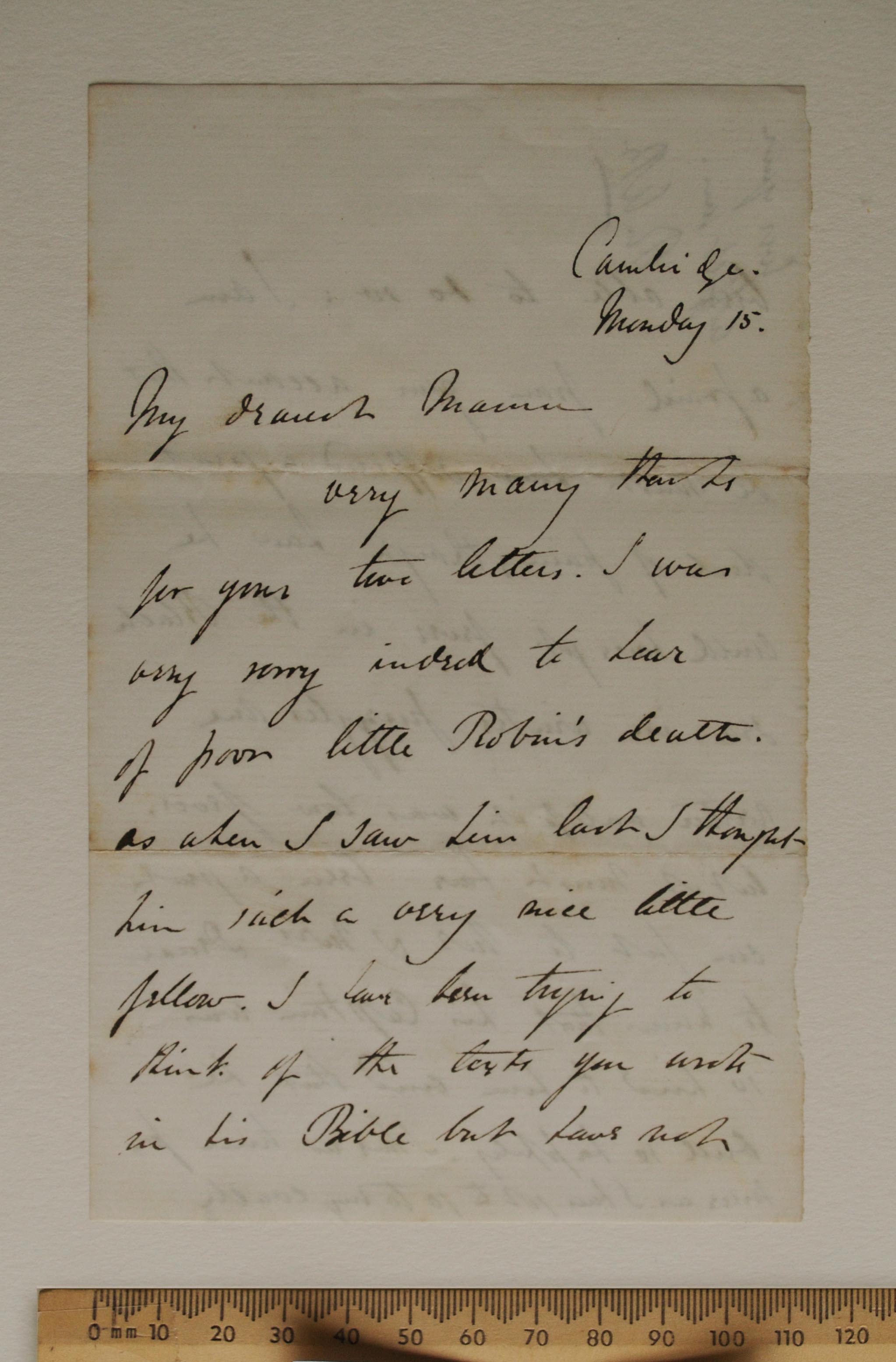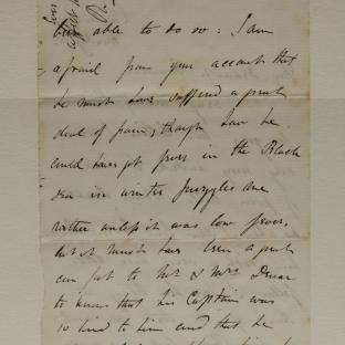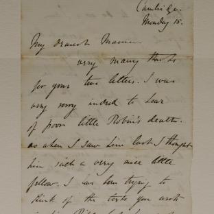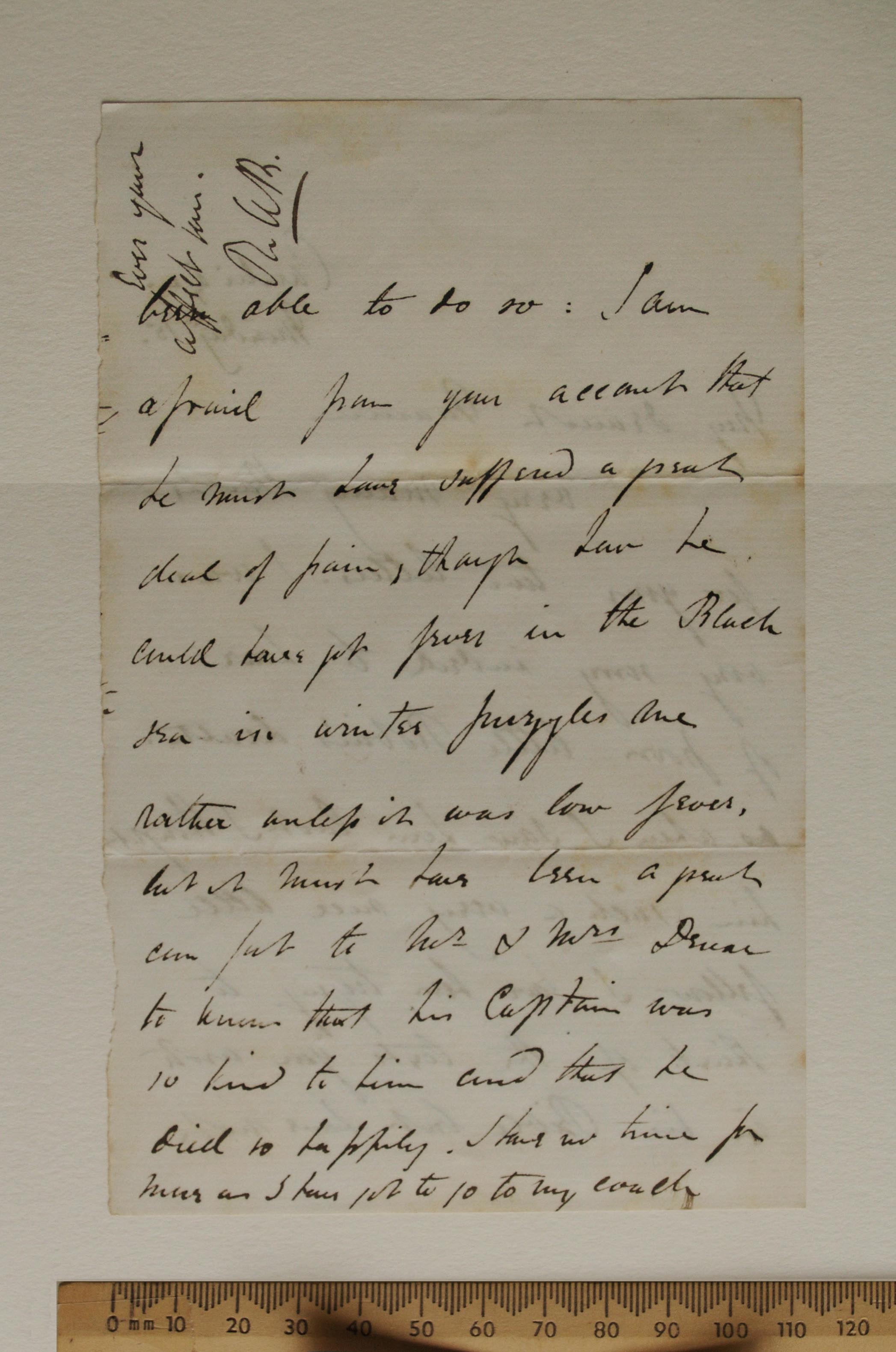 Very many thanks for your two letters. I was very sorry indeed to hear of poor little Robin’s death, as when I saw him last I thought him such a very nice little fellow. I have been trying to think of the texts you wrote in his Bible but have not been able to do so: I am afraid from your account that he must have suffered a great deal of pain, though how he could have got fever in the Black Sea in winter puzzles me rather, unless it was low fever. But it must have been a great comfort to Mr and Mrs Dewar to know that his Captain was so kind to him and that he did so happily. I have not time for more as I have got to go to my coach,