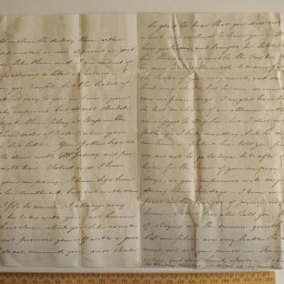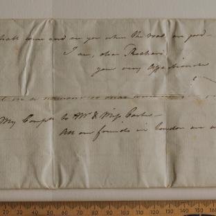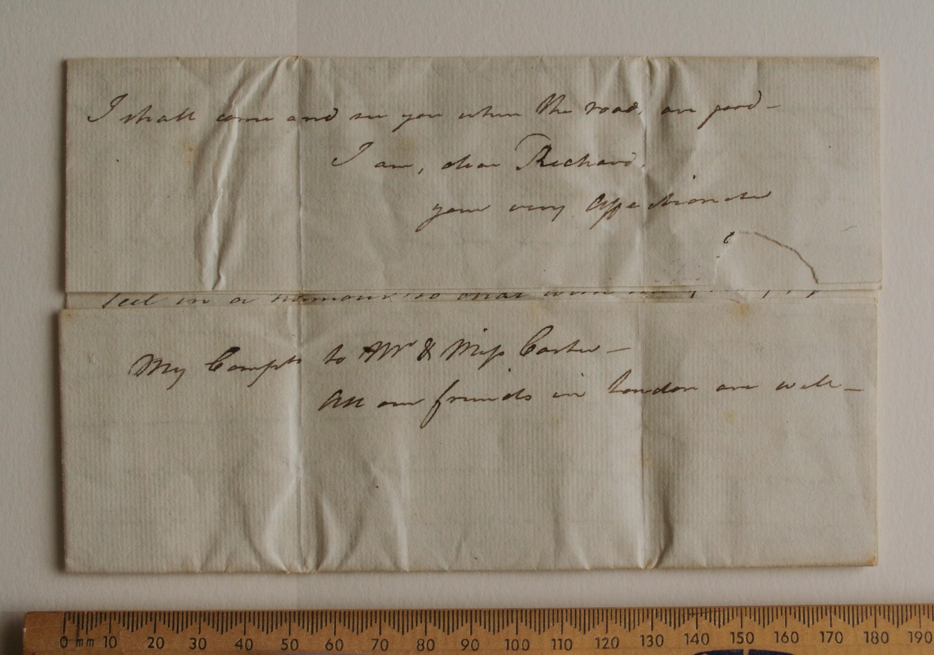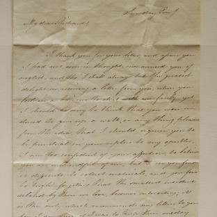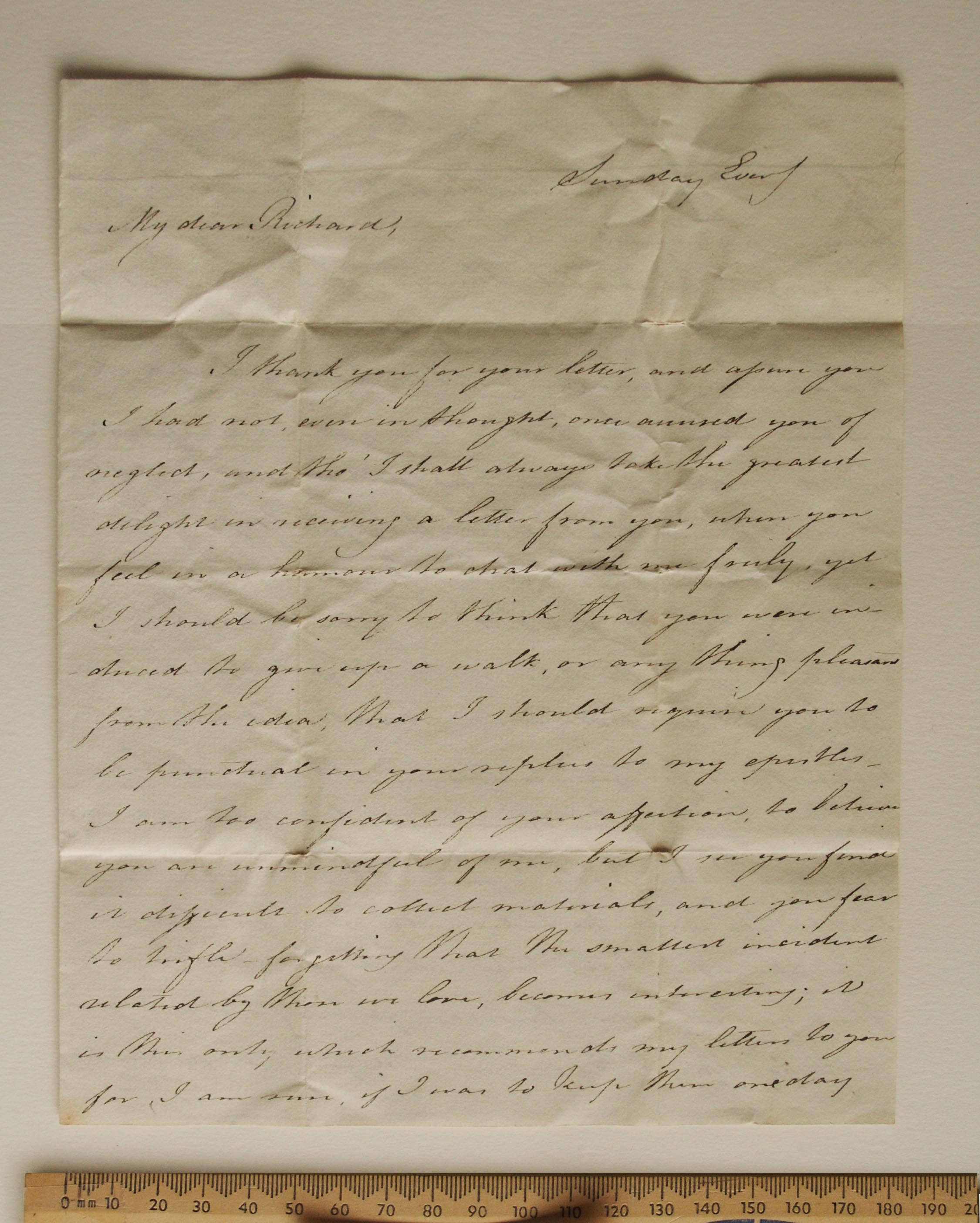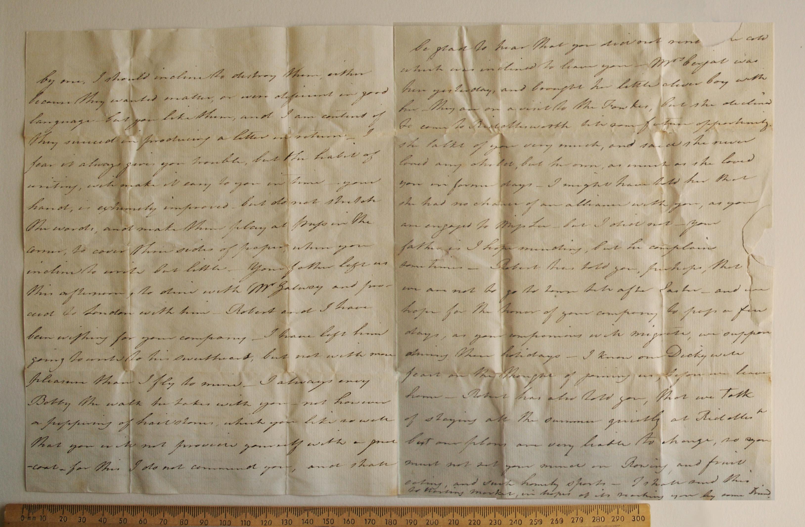 I thank you for your letter, and assure you I had not, even in thought, once accused you of neglect, and tho’ I shall always take the greatest delight in receiving a letter from you, when you feel in a humour to chat with me freely yet I should be sorry to think that you were induced to give up a walk, or anything pleasant from the idea, that I should require you to be punctual in your replies to my epistles - I am too confident of your affection to believe you are unmindful of me, but I see you find it difficult to collect materials, and you fear to trifle - forgetting that the smallest incident as told by those we love, becomes interesting;  It is this only which recommends my letters to you for I am sure if I was to keep them one day by me, I should incline to destroy them, either because they wanted matter, or were deficient in good language but you like them and I am content if they succeed in producing a letter in return. I fear it always gives you trouble, but the habit of writing, will make it easy for you in time - your hand, is extremely improved, but do not stretch the word, and make them play at [-] [barely legible text] in the corner, to cover three sides of paper, when you incline to write but little - your father left us this afternoon to dine with Mr Galway and proceed to London with him - Robert and I have been wishing for your company - I have left him going to write to his sweetheart, but not with more pleasure than I to mind - I always envy Bobby the walk he takes with you - not however a peppering of hailstones, which you like so well that you will not provision yourself with a great coat - for this I do not commend you, and shall be glad to hear that you did not [-] [barely legible text and torn] cold which was inclined to have you - Mrs Cerjan was here yesterday, and brought her little clever boy with her - they are on a visit to the Fowkes, but she Declined to come to Riddlesworth with some future opportunity. She talks of you very much, and said she never loved any child but her own as much as she loved you in former days - I might have told her that she had no chance of an alliance with you, as you are engaged to Miss Lu - but I did not - your father is I hope minding, but he complains sometimes - Robert has told you, perhaps, that we are not to go to town till after Easter - and we hope for the honour of your company to pass a few days, as your companions will migrate, we suppose during those holidays - I know our Dicky will feast on the thought of joining us, before we leave home - Robert has also told you, that we talk of staying all the summer quietly at Riddles[wor]th but our plans are very liable to change, so you must not set your mind on rowing and fruit eating, and such homely sports – I shall send this so [-] [barely legible text] - in hopes of its reaching you by some friend