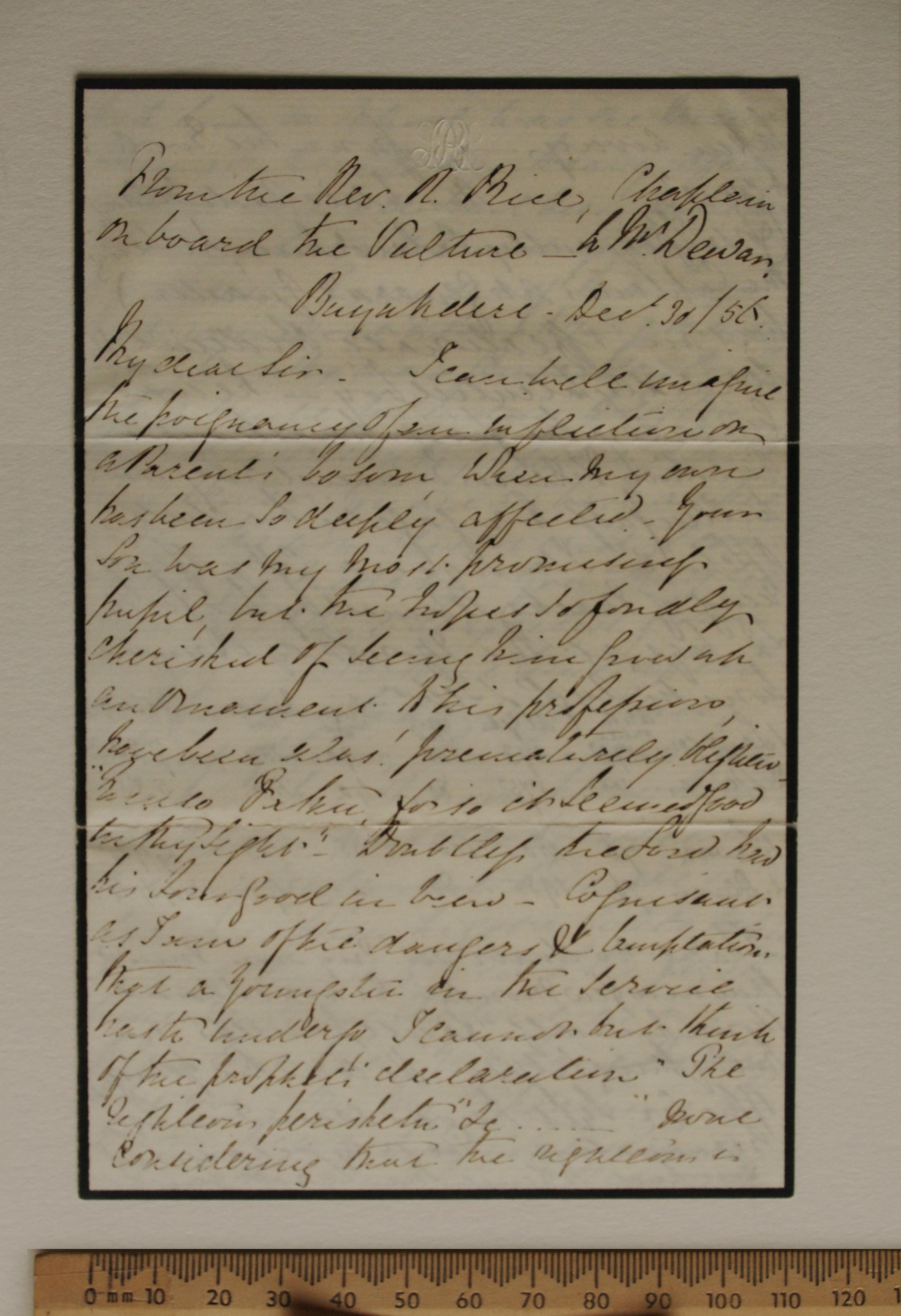 From the Rev. R Rice, Chaplain on board the Vulture - to Mr. Dewar