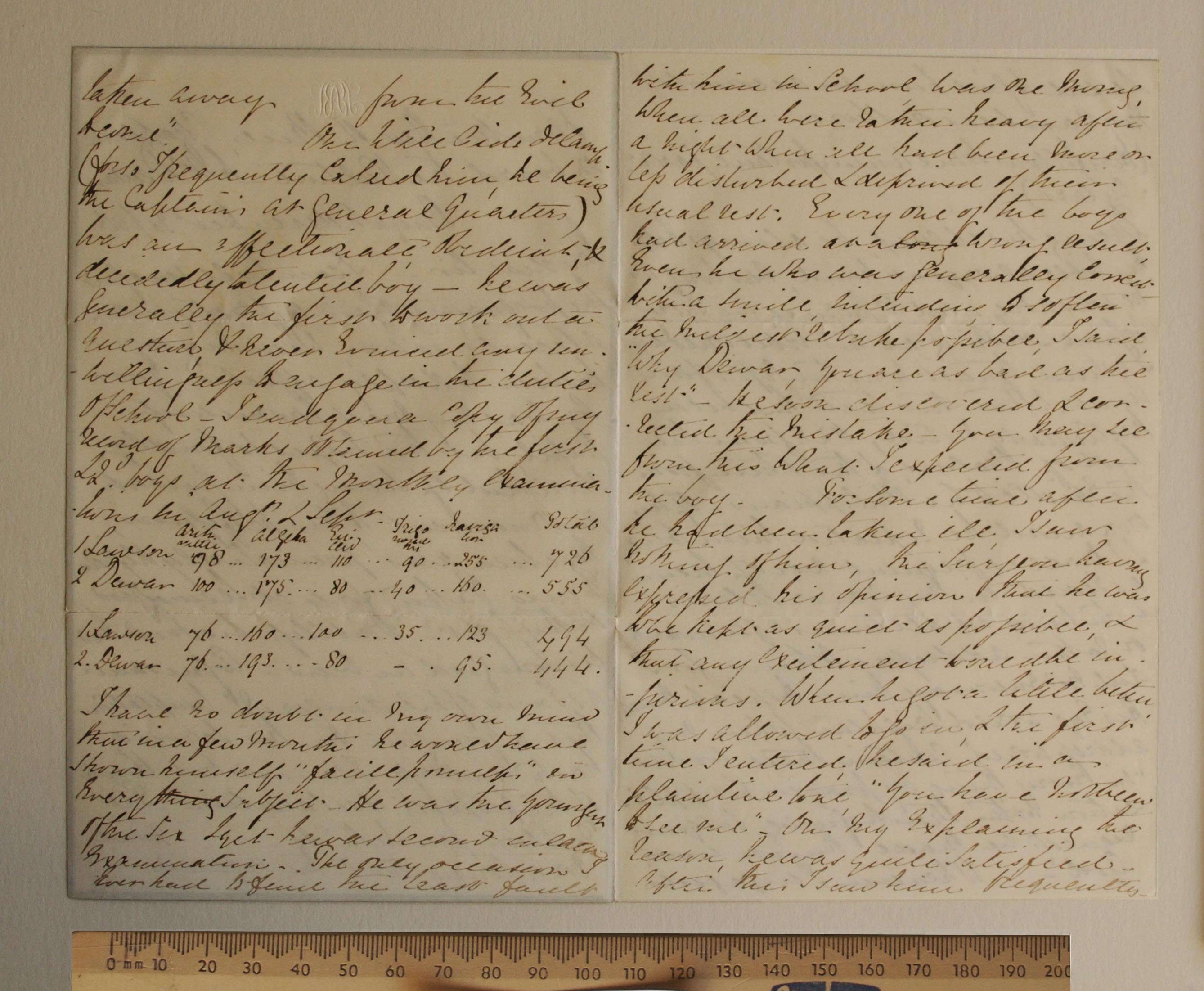 I can well imagine the poignancy of an infliction on a Parent’s bosom, when my own has been so deeply affected - Your son was my most promising pupil, but the hopes so fondly cherished of seeing him grow up an ornament to his profession have been alas! prematurely blighted “Even so Extra for so it Seemed Good be thy Sight” Doubtless the Lord had his [-] [barely legible text] good in view. Cogniscent as I am of the dangers & temptations that a youngster in the Service has to undergo I cannot but think of the prophet’s Declaration “The Righteous perisheth” &c . . . ...” [-] [barely legible text] considering that the righteous is taken away from the Evil [-] [barely legible text]” Our little Aide de Camp (for so I frequently Called him, he being the Captain’s at General Quarters) was an affectionate, obedient, & decidedly talented boy - he was generally the first to work out a question, & never evinced any unwillingness to engage in the duties of school - I send you a Copy of my record of marks obtained by the first & 2d boys at the monthly examinations in Augt & Sept.