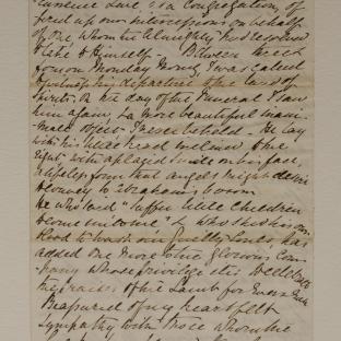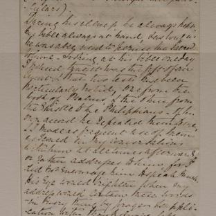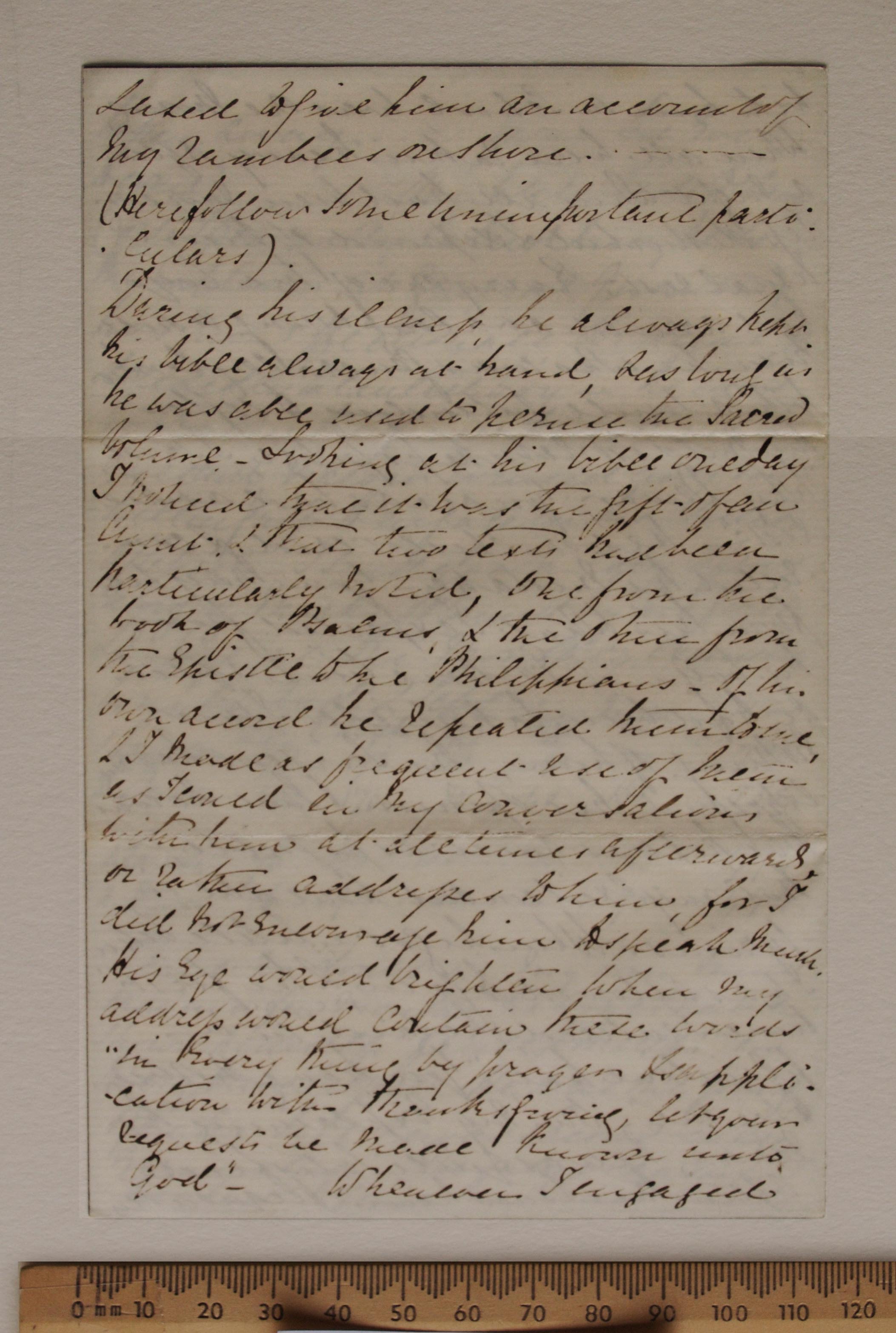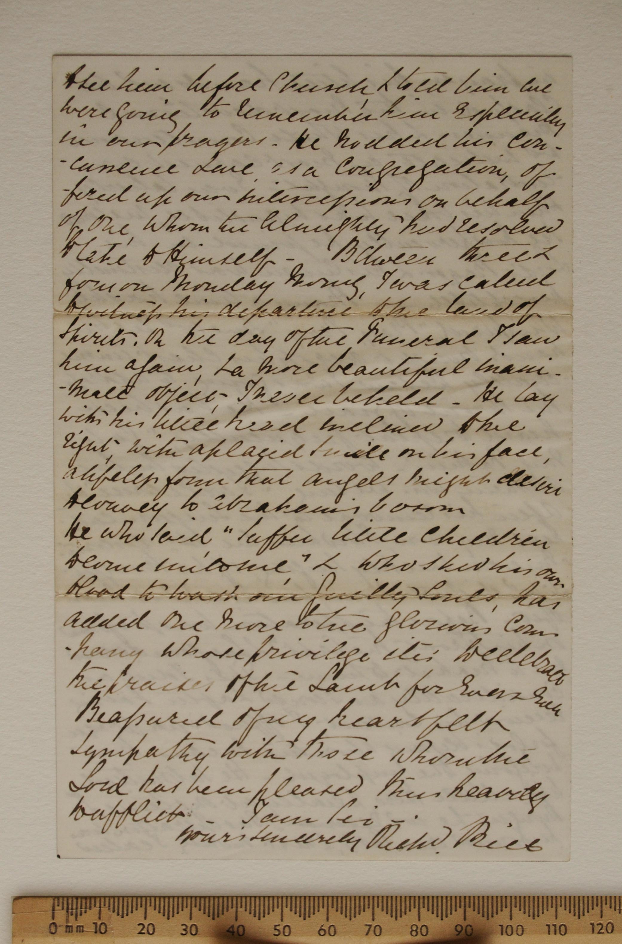 During his illness, he always kept his bible always at hand, & as long as he was able used to peruse the Sacred Volume - Looking at his bible one day I noticed that it was the gift of an Aunt, & that two texts had been particularly noted, one from the book of Psalms, & the other from the Epistle of the Philippians - of his own accord he repeated them to me, & I made as frequent use of them as I could in my conversations with him at all times afterwards, or rather addresses to him, for I did not encourage him to speak much. His eye would brighten when my address would contain these words “in every thing by prayer & supplication with thanksgiving, let your requests be made known unto God.” - Whenever I engaged in prayer, his little hands wd be clasped in the most devotional manner & his whole countenance wd indicate a most earnest concentration of thought - Even latterly when his voice was inaudible, we could see how fervently he joined in the Lord’s Prayer & his Amen was distinctly perceptible. - Many a time has he whispered, “Pray, Pray” & we would see his hands brought across his chest immediately he saw I was going to address the throne of Grace - he has been heard to repeat frequently, “Go to my Father” - words suggested by the anthem wh. we sing, “I will arise.” &c. After his removal to the Surgeon’s cabin next my own, I told him we shd discontinue our weekly singing, if he thought it wd disturb him, but he wd not hear of it - Before the operation was performed on his throat, the Captn & Surgeon desired me to break it to him - This I did as considerately as I could & after having received his consent, - I offered up a prayer for God’s blessing upon the means that were going to be employed - He submitted like a little Hero, & really at the time, I thought he wd recover - The operation was performed on a Sat.y, & next morning I called to see him before Church & told him we were going to remember him especially in our prayers - He nodded his con[-] [barely legible text] & we, as a congregation offered up our intercessions on behalf of one, whom the Almighty had resolved to take to Himself - Between three & four on Monday morning, I was called to witness his departure to the land of Spirits. On the day of the Funeral I saw him again, & a more beautiful inanimate object I never beheld - He lay with his little head inclined to the right, with a placid smile on his face, a lifeless form that angels might desire to convey to Abraham’s bosom. He who said, “Suffer little Children to come unto me,” & who shed his own blood to wash our guilty souls, has added the more to the glorious company whose privilege it is to celebrate the praises of the Saints for Ever & Ever. Be assured of my heartfelt sympathy with those whom the Lord has been pleased this heavily to afflict -
