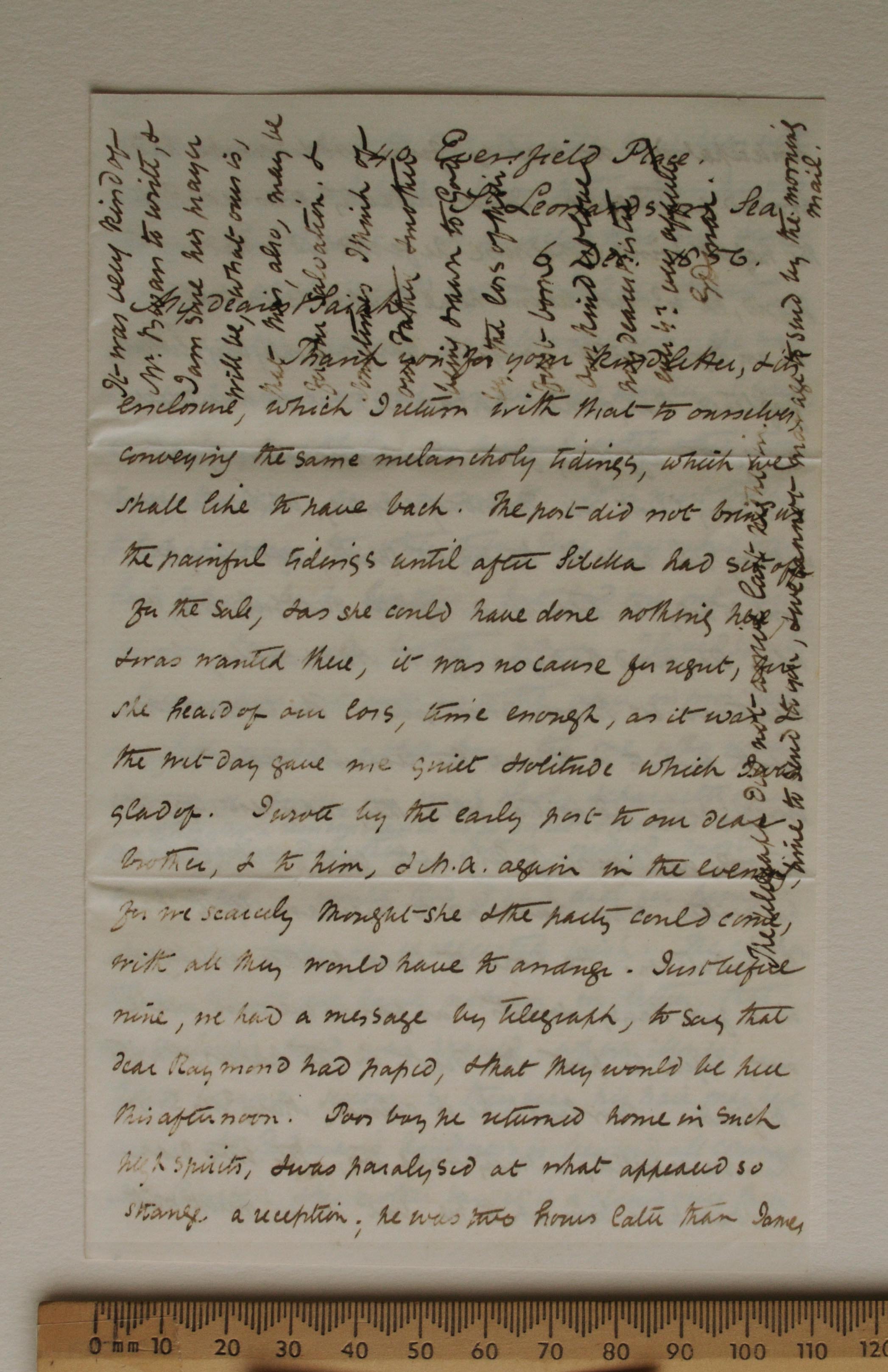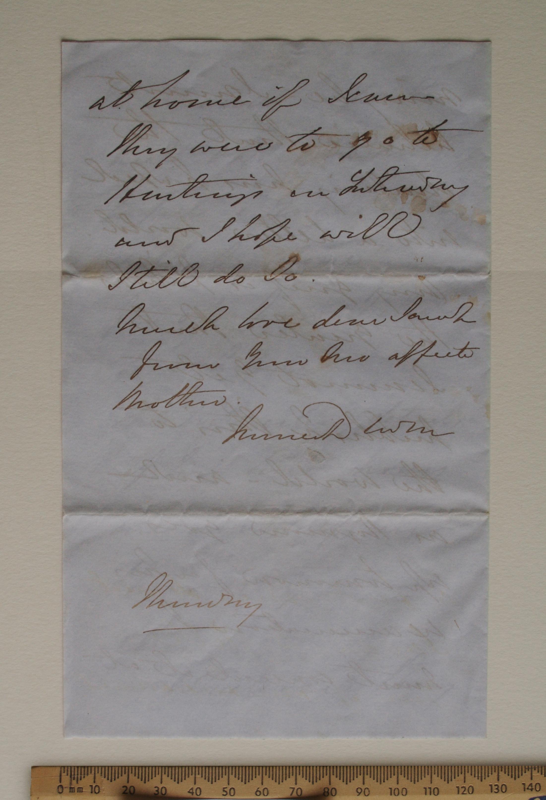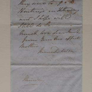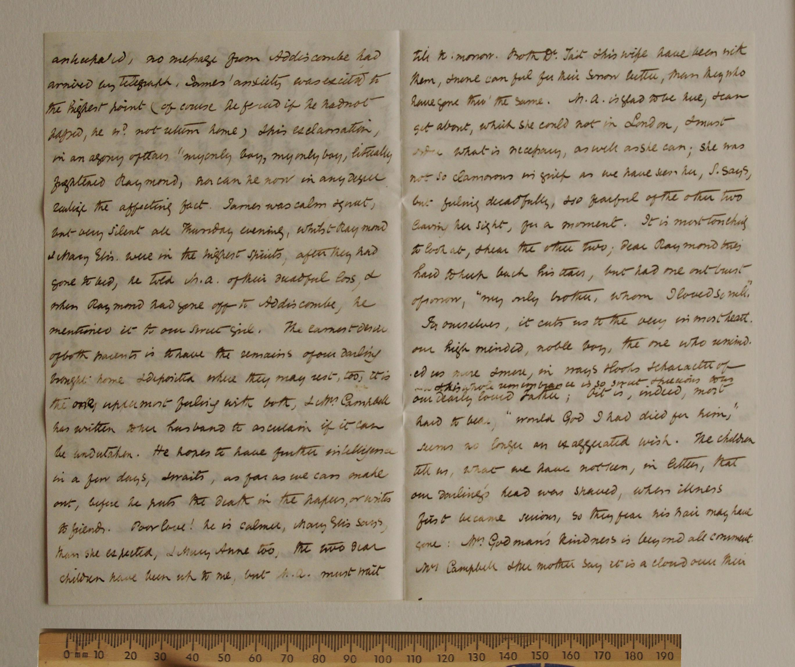 Thank you for your kind letter, & its enclosure, which I return with that to ourselves conveying the same melancholy tidings, which we shall like to have back. The post did not bring us the painful tidings until after Sibella had set off for the sale, & as she could have done nothing here & was wanted there, it was no cause for regret, for she heard of our loss, time enough, as it was the next day gave me quiet solitude which I was glad of. I wrote by the early post to our dear brother, & to him, and MA again in the evening for we scarcely thought she & the party could come with all they would have to arrange. Just before nine we had a message by to say that dear Raymond had passed, & that they would be here this afternoon. Poor boy he returned home in such high spirits, & was paralysed at what appeared so strange a reception; he was two hours later than James anticipated, no message from had arrived by , James’ anxiety was excited to the highest point (of course he feared if he had not passed he wd not return home) This exclamation, in an agony of tears “my only boy, my only boy”, literally frightened Raymond, nor can he ever in any degree realise the affecting fact. James was calm and quiet, but very silent all Thursday evening, whilst Raymond and Mary Elis. were in the highest spirits, after they had gone to bed, he told MA of their dreadful loss & when Raymond had gone off to , he mentioned it to our sweet girl. The earnest desire of both parents is to have the remains of our darling brought home & deposited where they may rest, too, it is the one uppermost feeling with both, & Mrs Campbell has written to her husband to ascertain if it can be undertaken. He hopes to have further intelligence in a few days, & waits, as far as we can make out, before he puts the death in the papers, or writes to friends. Poor love! he is calmer Mary Elis says, than she expected, & Mary Anne too. The two dear children have been up to me, but M.A must wait till to morrow. Both Dr Tait & his wife have been with them, & none can feel for their sorrow better than they who have gone thru’ the same. M.A is glad to be here, & can get about, which she could not in London & must order what is necessary, as well as she can; she was not so clamorous in grief as we have seen her, S. says, but feeling dreadfully, & so fearful of the other two leaving her sight for a moment. It is most touching to look at, & hear the other two; Dear Raymond tries hard to keep back his tears, but had one outburst of sorrow, “my only brother, whom I loved so well”.