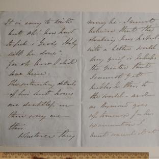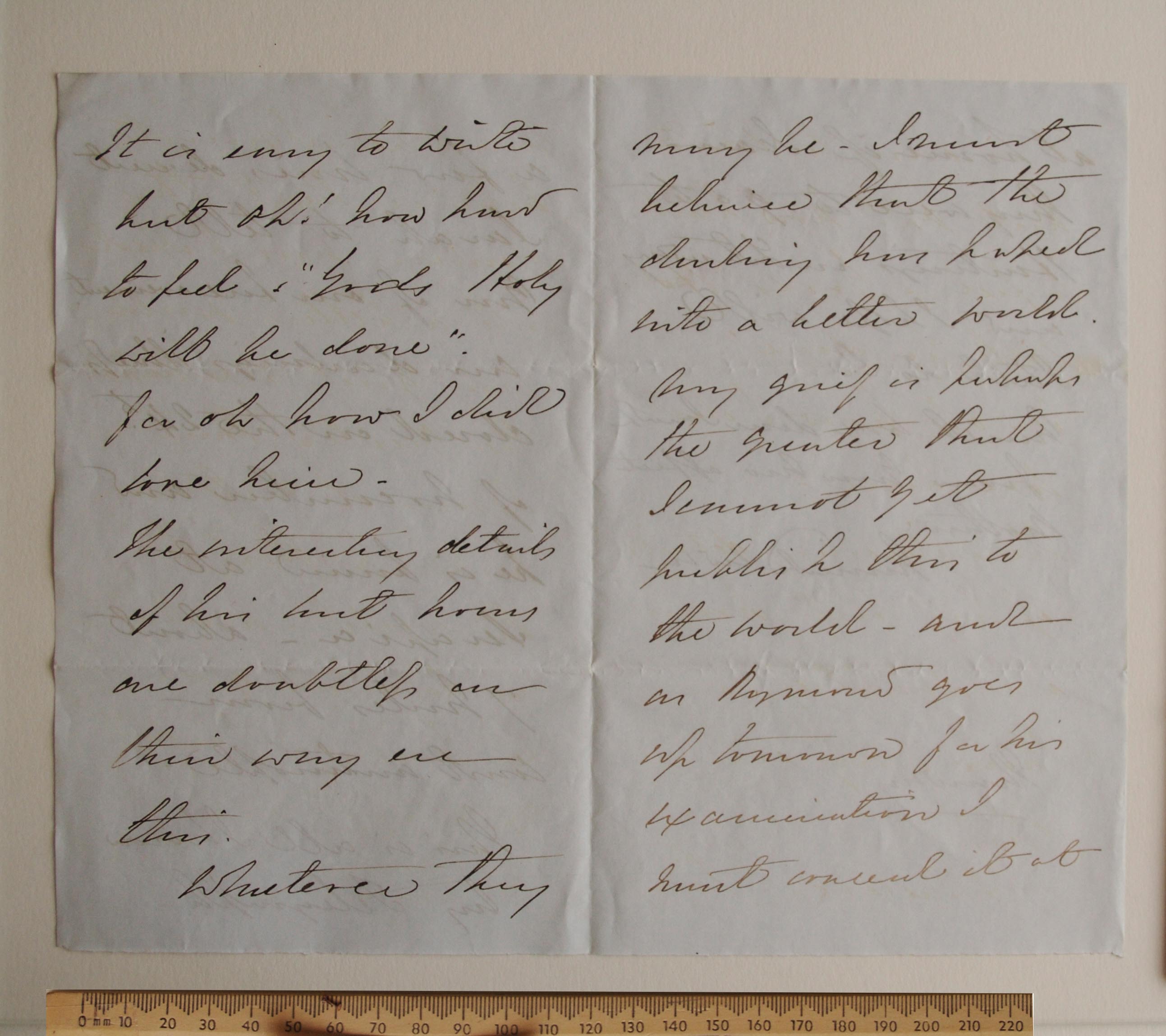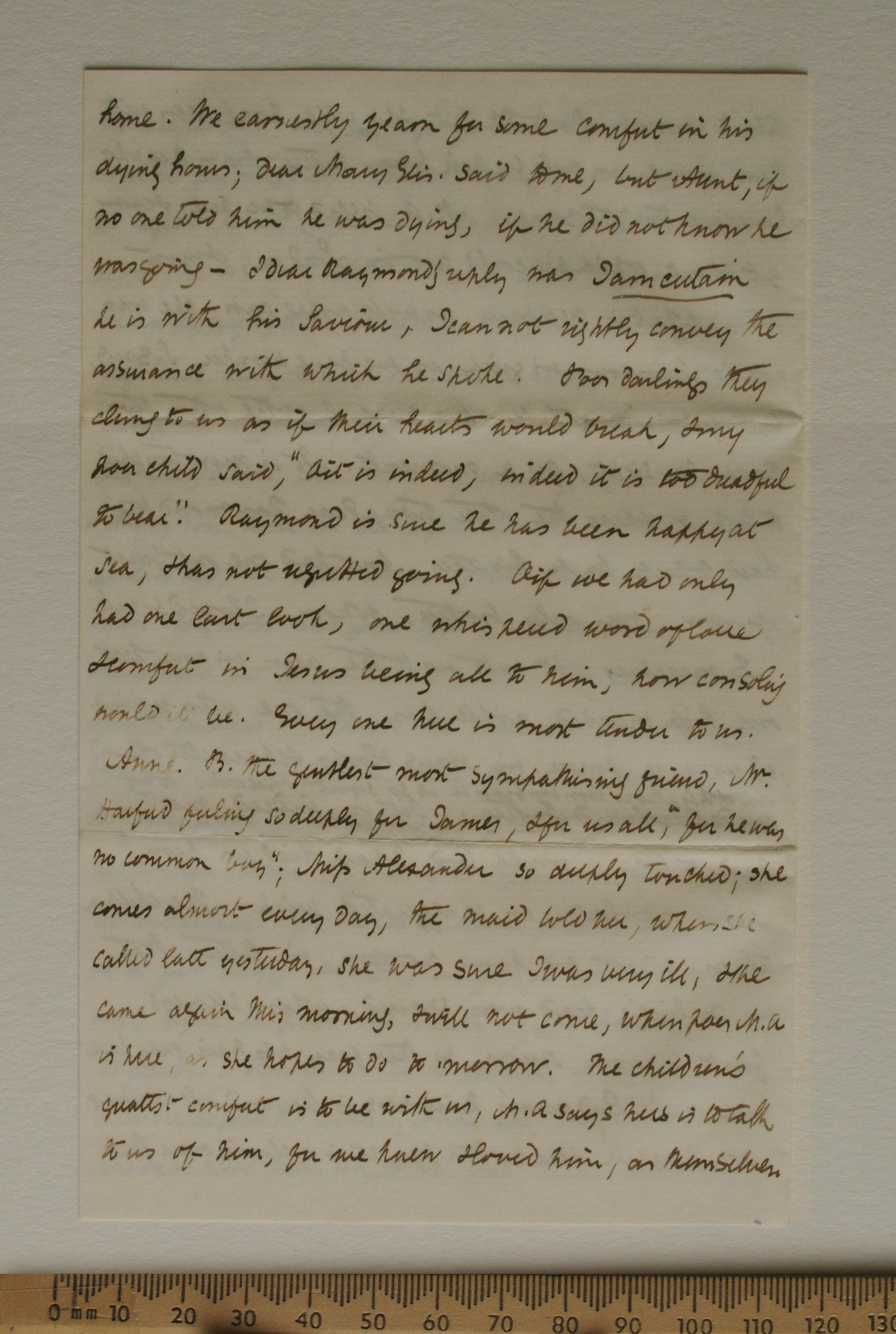 For ourselves, it cuts us to the very in most heart. Our high minded, noble boy, the one who reminded us more & more, in ways & looks & character of our dear loved father; & it is indeed most hard to bear ^this whole remembrance is so sweet and precious to us. “would God I had died for him”, seems no longer an exaggerated wish. The children tell us, what we have not seen, in letters, that our darling’s head was shaved, when illness first became serious, so they fear his hair may have gone: Mrs Godman’s kindness is beyond all comment. Mrs Campbell & her mother say it is a cloud over their home. We earnestly yearn for some comfort in his dying hours; dear Mary Elis. said to me, but Aunt, if no one told him he was dying, if he did not know he was going - & dear Raymond’s reply was I am certain he is with his Saviour, I can not rightly convey the assurance with which he spoke. & our darlings they clung to us as if their hearts would break, & my dear child said, ”O it is indeed, indeed it is too dreadful to bear”. Raymond is sure he has been happy at sea, & has not regretted going. & if we had only had one last look, one whispered word of love & comfort in Jesus being all to him, how consoling would it be. Everyone here is most tender to us. Anne B the gentlest most sympathising friend, Mr Halford feeling so deeply for James, & for us all ”for he was no common boy”; Miss Alexander so deeply touched; she comes almost every day, the maid told her, when she called late yesterday, she was sure I was very ill, & she came again this morning, & will not come, when poor M.A is here, as she hopes to do to’morrow. The children’s greatest comfort is to be with us. M.A says hers is to talk to us of him, for we knew & loved him, as themselves.