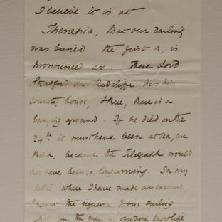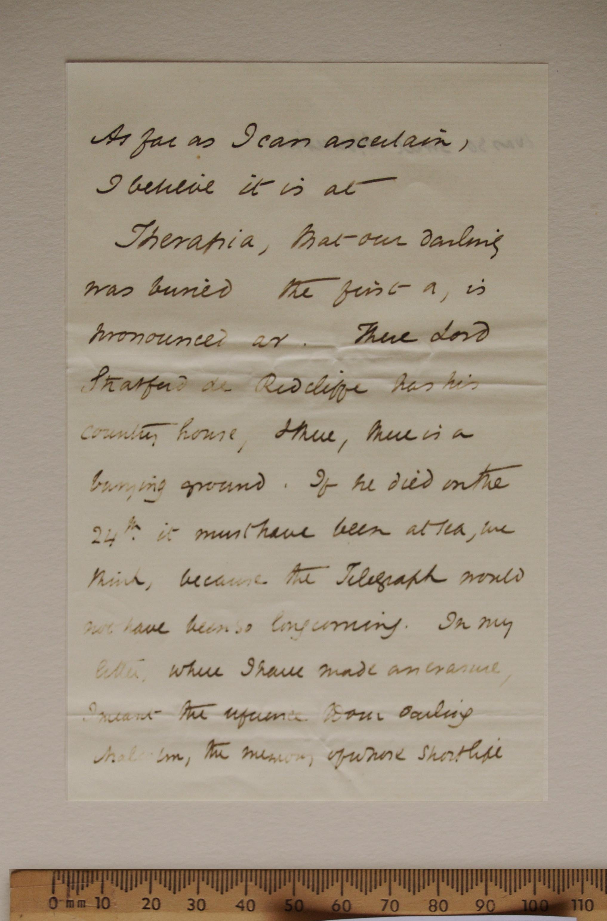 As far as I can ascertain, I believe it is at , that our darling was buried. The first a is pronounced ar. There Lord Stratford de Radcliffe has his country house, & there, there is a burying ground. If he died on the 24th it must have been at sea, we think, because the would not have been so long coming. In my letter where I have made an erasure I meant the [-] [barely legible text] to our darling Malcolm, the memory of whose short life was so sweet & precious.