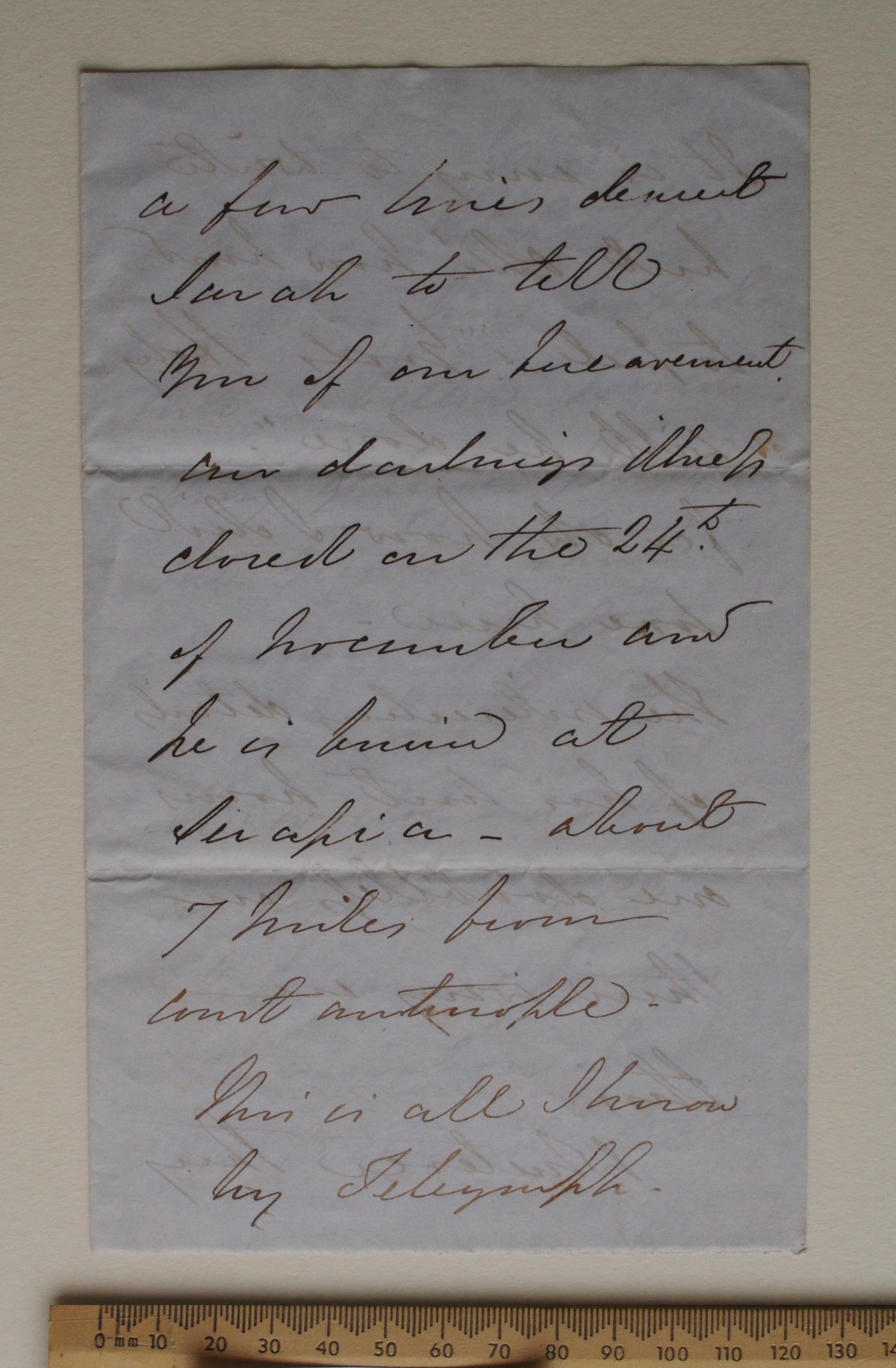 A few lines dearest Sarah to tell you of our bereavement. Our darling’s illness closed on the 24th of November and he is buried at - about 7 miles from .