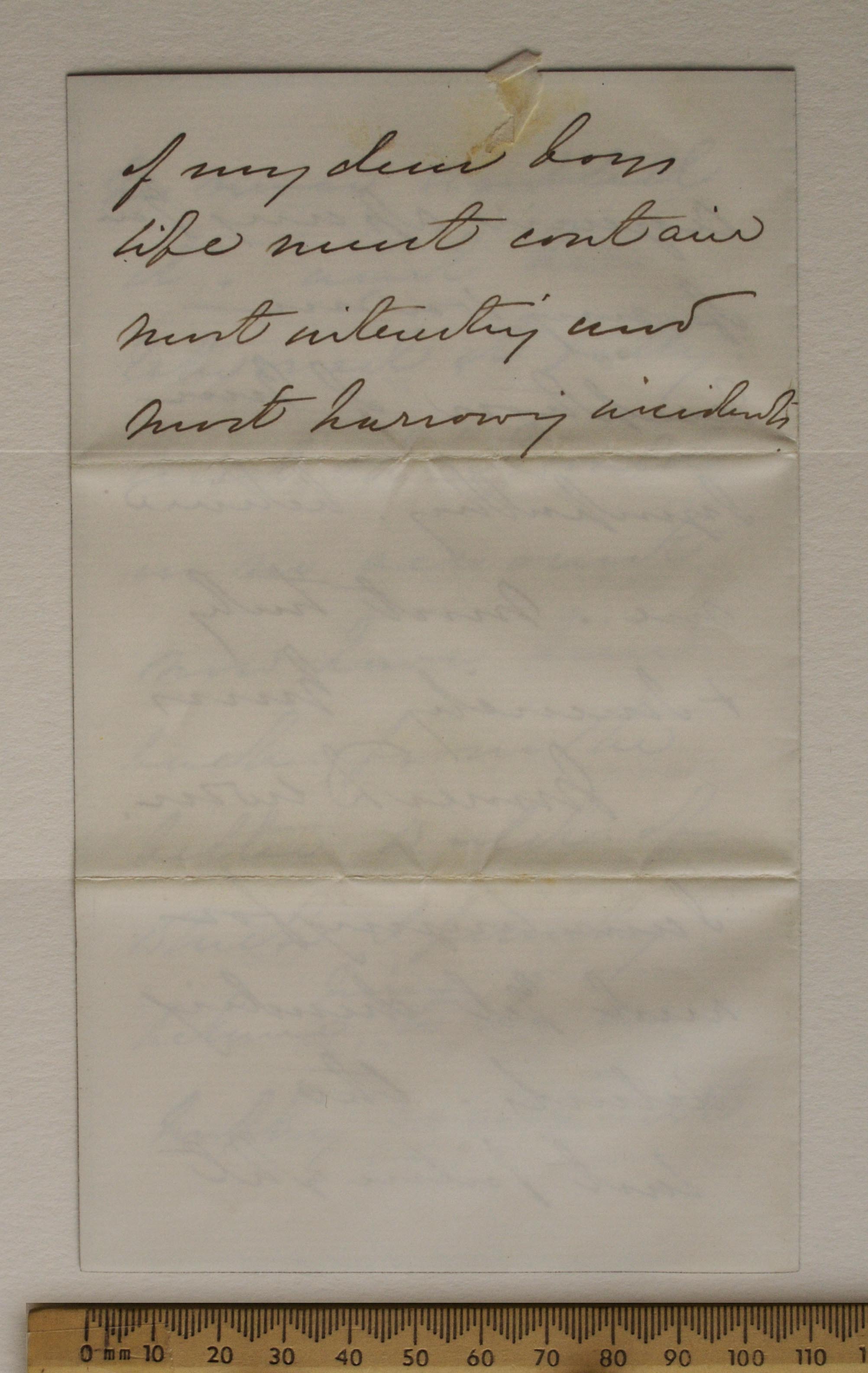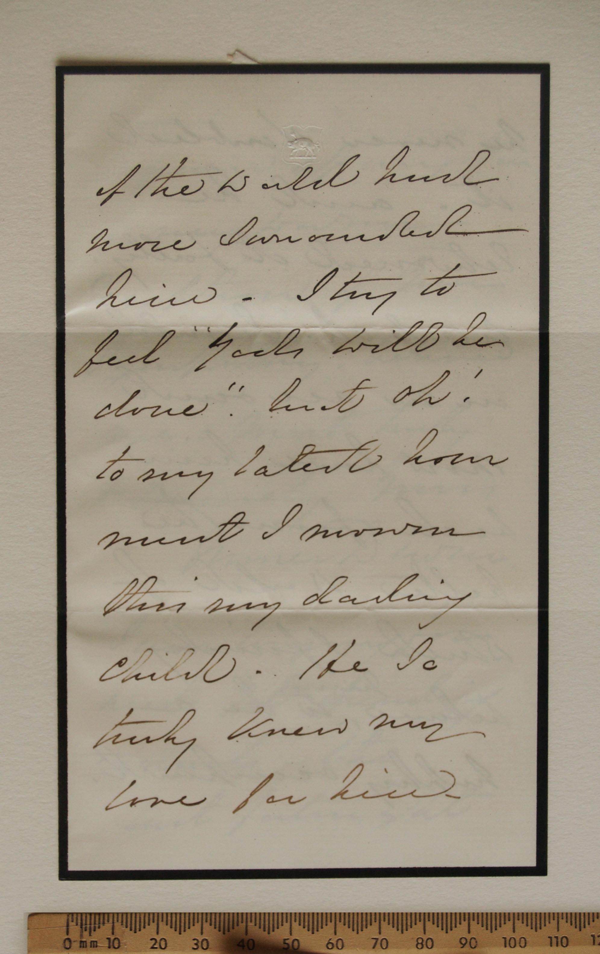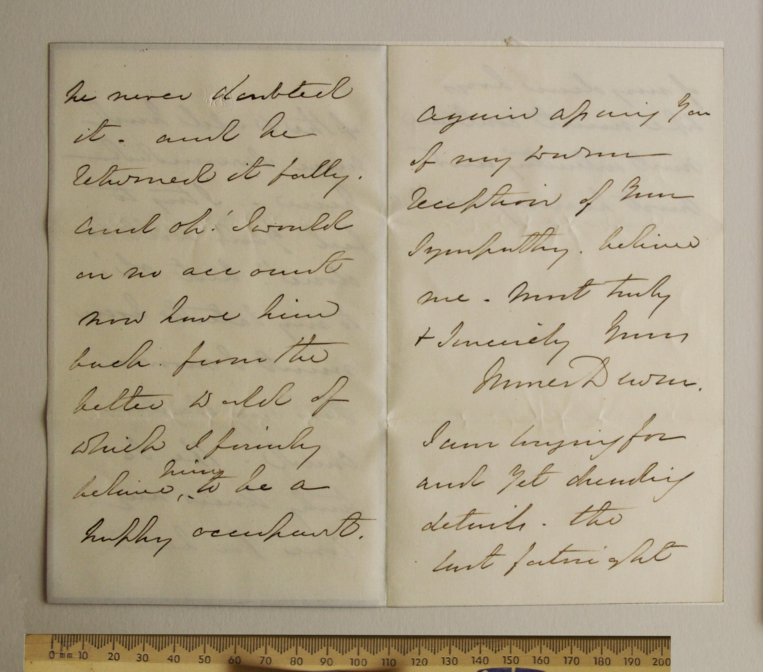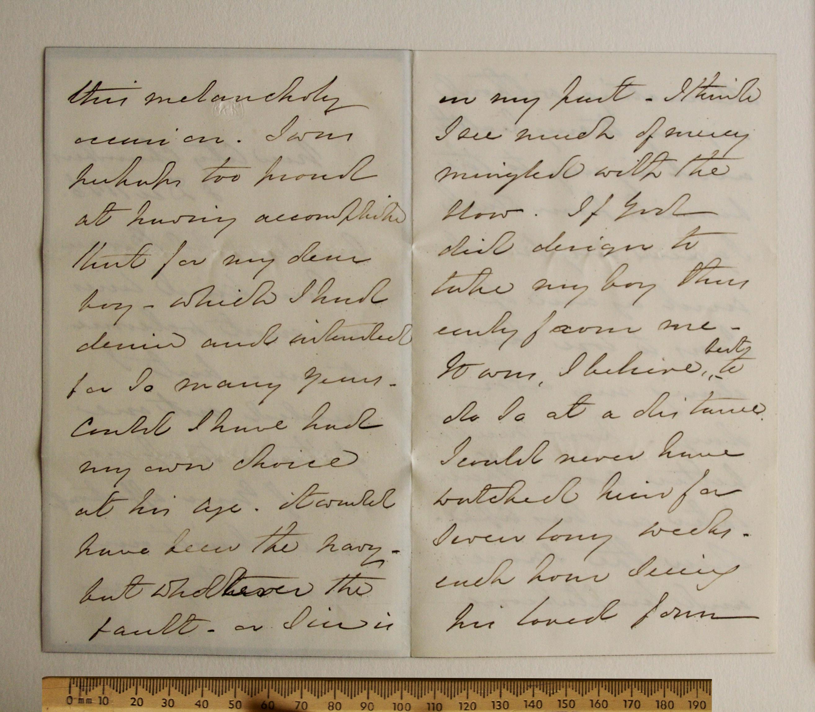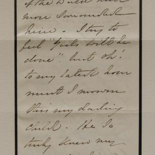 Your kind lines are most welcome to me. but I needed not one of them to assure me of your affectionate and Christian sympathy on this melancholy occasion. I was perhaps too proud at having accomplished that for my dear boy - which I had denied and intended for so many years. Could I have had my own choice at his age, it would have been the navy - but whosever the fault or desire on my part - I think I see much of envy mingled with the blow. If God did design to take my boy this early from me it was, I believe, better to do so at a distance. I could never have watched him for seven long weeks, each hour seeing his loved form attenuating without injury to my health and injury to the [-] [barely legible text] from which I gain my [-] [barely legible text] and again if I was to love him during my own days how much better now than later on in his life when the [-] [barely legible text] and temptations of the world had more surrounded him. I try to feel “Gods will be done” but oh! to my latest hour must I mourn this my darling child. He so truly knew my love for him. He never doubted it and he returned it fully and oh! I would on no account now have him back from the better world of which I firmly believe him to be a happy occupant. Again assuring you of my warm reception of your sympathy, believe me. Most truly & sincerely yours
