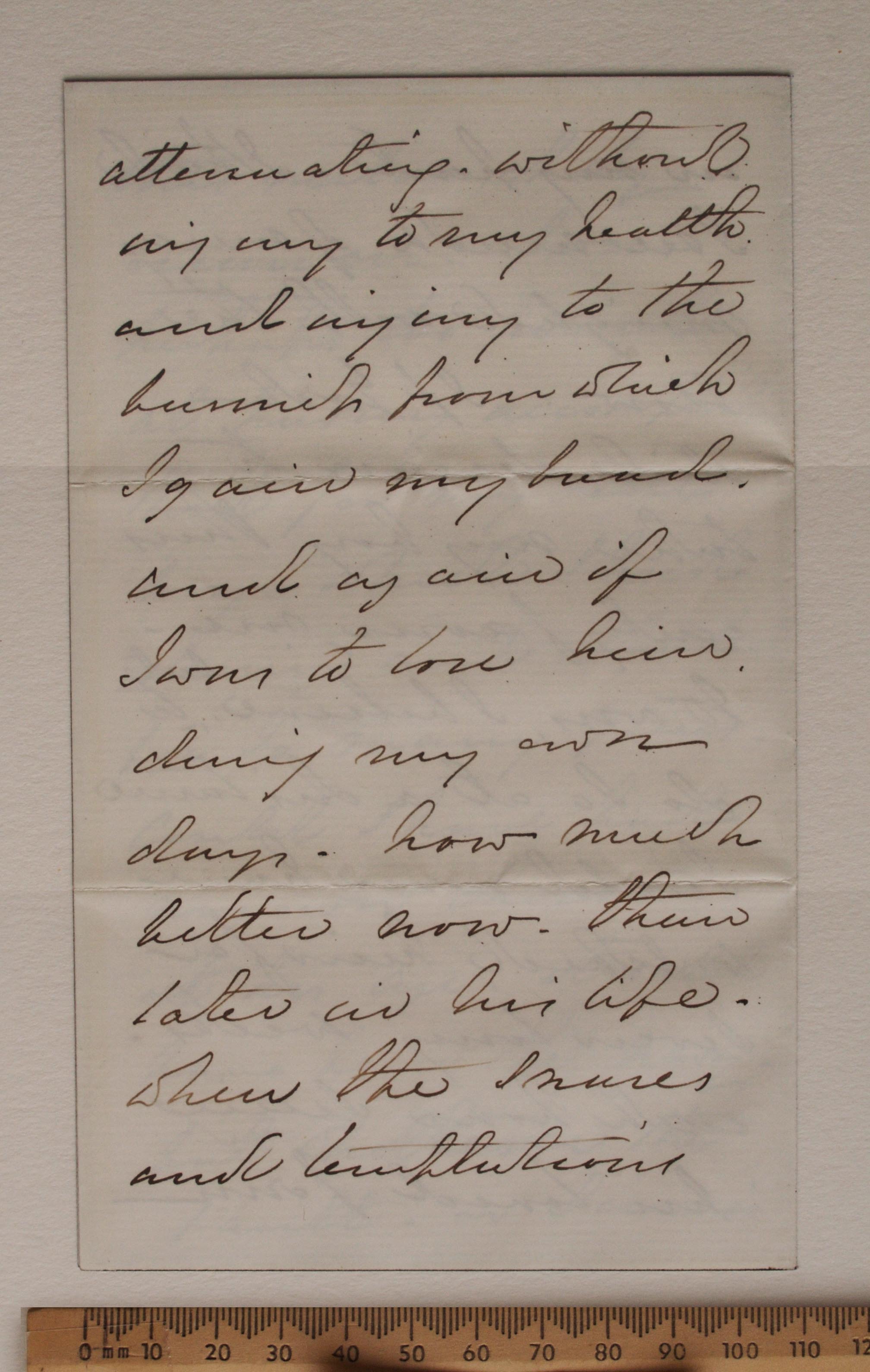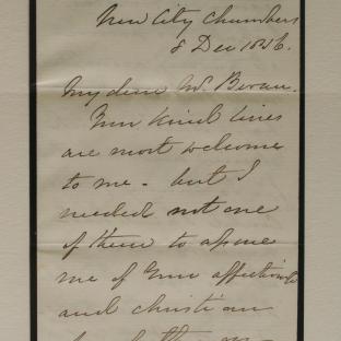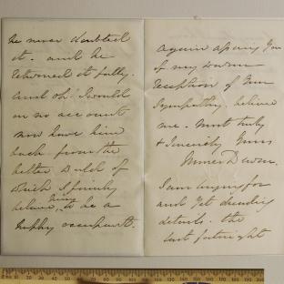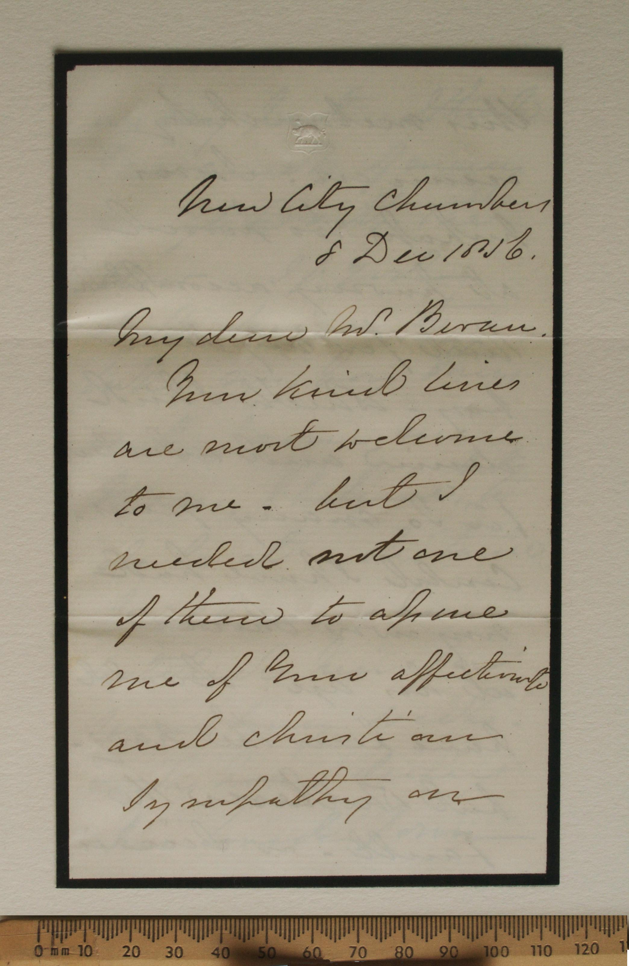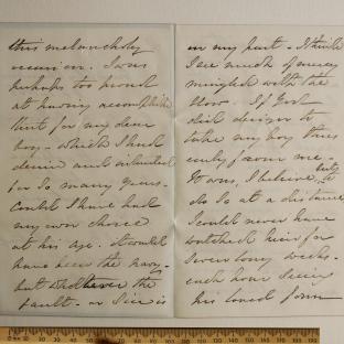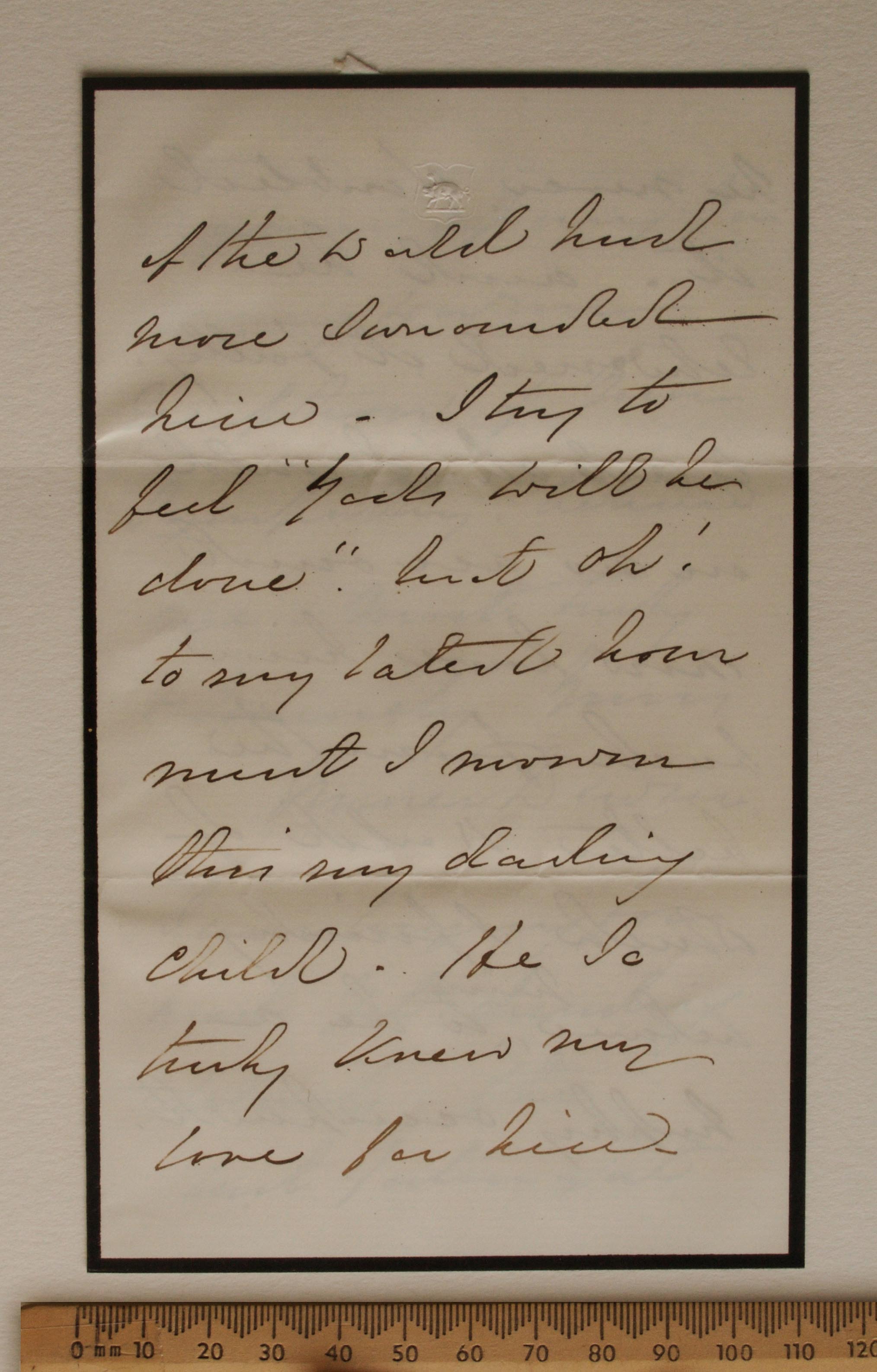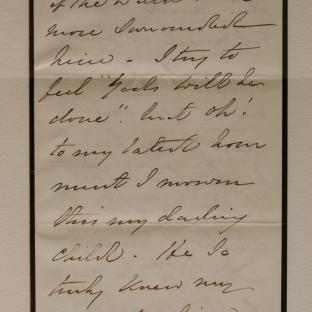 Your kind lines are most welcome to me. but I needed not one of them to assure me of your affectionate and Christian sympathy on this melancholy occasion. I was perhaps too proud at having accomplished that for my dear boy - which I had denied and intended for so many years. Could I have had my own choice at his age, it would have been the navy - but whosever the fault or desire on my part - I think I see much of envy mingled with the blow. If God did design to take my boy this early from me it was, I believe, better to do so at a distance. I could never have watched him for seven long weeks, each hour seeing his loved form attenuating without injury to my health and injury to the [-] [barely legible text] from which I gain my [-] [barely legible text] and again if I was to love him during my own days how much better now than later on in his life when the [-] [barely legible text] and temptations of the world had more surrounded him. I try to feel “Gods will be done” but oh! to my latest hour must I mourn this my darling child. He so truly knew my love for him. He never doubted it and he returned it fully and oh! I would on no account now have him back from the better world of which I firmly believe him to be a happy occupant. Again assuring you of my warm reception of your sympathy, believe me. Most truly & sincerely yours