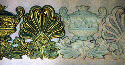 In many affluent Regency homes plaster decoration was frequently picked out in gilt, sometimes to excess. By the 1820s, the use of gilding on interior mouldings had begun to decline somewhat, but it continued to be used to enhance furniture woodwork and picture frames. Gilded lacquer work - classical gold motifs on a black background - was popular during the Regency.