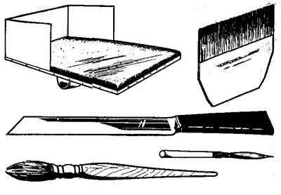 The surface to be gilded is first cleaned and smoothed. If the material is porous, such as plaster, shellac is applied to seal its surface. For burnished leaf gilding, the surface must next take a coat of rabbit skin glue size, followed by a coat of ‘gesso' a solution derived from boiled parchment cuttings mixed with gilder’s whiting, linseed oil or tallow. The gesso is next covered with Armenian bole, a red earth and pipe clay solution applied with a hog or camel hair brush. After receiving several coats of bole, the surface is then smoothed and burnished before the gold leaf is finally applied.