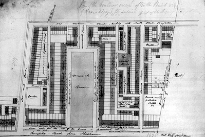 The new owner would be responsible for completing the building work. This cost represents his own financial investment in the scheme. Charles Elliott was a speculator who bought 16, 17 and 19 Brunswick Square. There are annotations on the plan. These show that George William Sawyer agreed to build the house for him "for £3000 to be finished complete, prepared, painted with all drains, stores and pavements, the fixtures to be set at Mr Sawyer's expense."