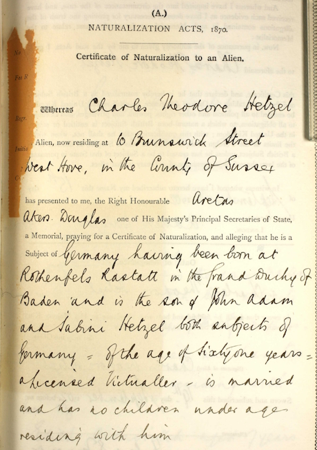 Charles Theodore Hetzel was born in 1841 in Germany in the Duchy of Baden. He received his naturalisation certificate when he was 61 in 1901.