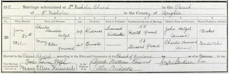 In 1911 Mary Ellen is working for the Furners. On 20 June 1911 she gets married at St Nicholas Church to Charles Theodore Hetzel. She is 45 and he is 69. Initially there was some doubt as to whether it was in fact our Mary Ellen as on the marriage certificate her father is described as a deceased undertaker yet on most of the censuses he is said to be a shoemaker. However, when his daughter Agnes Annie was baptised in 1888, he is said to be an undertaker. Maybe he did both jobs or told lies - we will never know. However, regarding Mary Ellen’s marriage, I think we can be pretty sure this is correct as all the other details fit the bill.