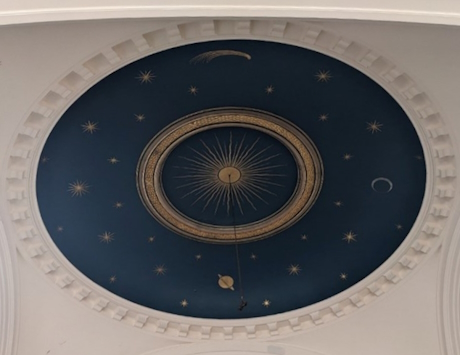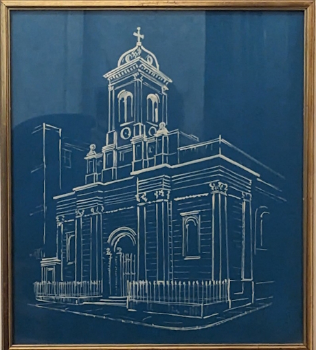The sanctuary was separated from the other two portions of the chancel and from the nave by wide arches, supported by Ionic columns. A dome was added, with gold stars on a blue background.