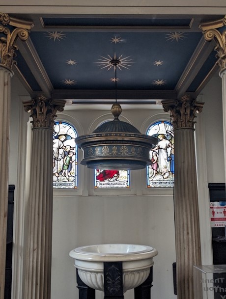 The interior was initially very simple; that of a plain box-like Regency preaching house, with only one gallery at the west end of the church and a nave. There was no chancel. The chief feature was the altarpiece at the east end of the nave, consisting of three round-headed niches containing panels inscribed with The Ten Commandments, The Lord’s Prayer and The Creed. These were flanked by a pair of simple pulpits or preaching desks, but without prominent curved staircases to them.