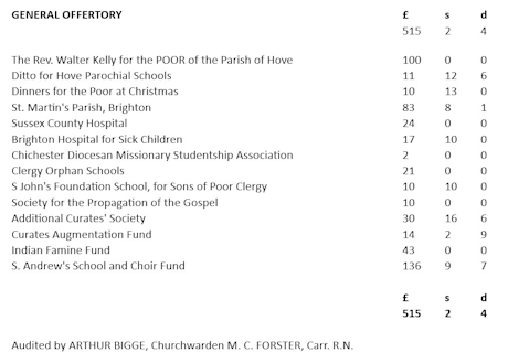 Some of Rev. Winham’s costs were obtained through public subscription. A fundraising event could also prove useful. For example, a Hove Bazaar was reported in 1908 for the sale of works in aid of funds for St. Andrew’s Church at the Town Hall by Lady George Nevill, ‘who wished it every success’. The most productive source, though, was the system of pew rents.