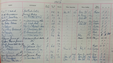 A register of pew rents was started in 1942. We find several titles amongst the contributors (Sir, Lady, General, Colonel, Major, Field Marshall) with local addresses predominating in the grander properties. Some of the ‘great and good’ in 1942 included Lady Hutchinson and Sir Cecil Bingham. In 1947 two guineas was paid per person per seat for the year and this price remained the same throughout a twenty-year period. Payments were either for a couple or single person.