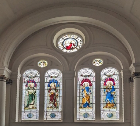 The east end was extended into a small, curved apse framing the altar, which was lit from above by a semi-circular window set in a domed roof. Twelve windows depicting the twelve Apostles were added, the work being done by Hardmans of Birmingham. All this transformed the interior from its former severity.