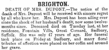 The death notice in the Sussex Express records that “…(she) has been ailing ever since the shock of her husband’s death, now some twelve-months since”.