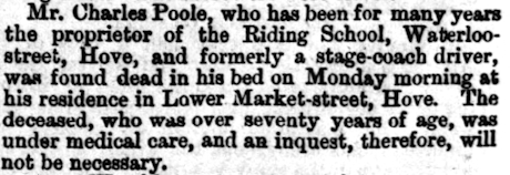 The 1871 census has Charles Pool (no ‘e’) listed at the West End Riding School, a ’ Riding Master’,aged 52, unmarried, born in Falmer. However, the 1871 Pages Directory lists John Parker as the Riding Master at the school, he was aged 25 and lived at 7 Upper Market Street.