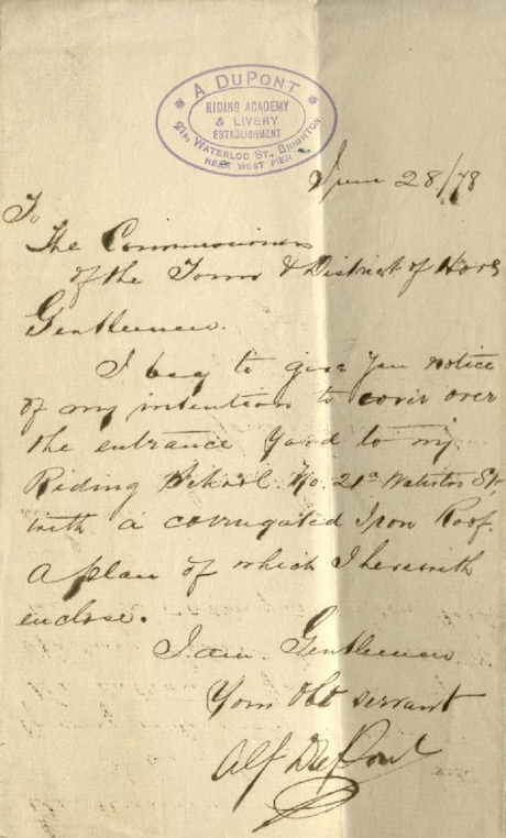 This article coincides with some major building work which Dupont instigated in 1886. Dupont submitted his plans for Alterations and Additions to the West Brighton Riding Academy in the February of that year. Hove Borough Council was created in 1875 and this is where Dupont submitted two of his plans.