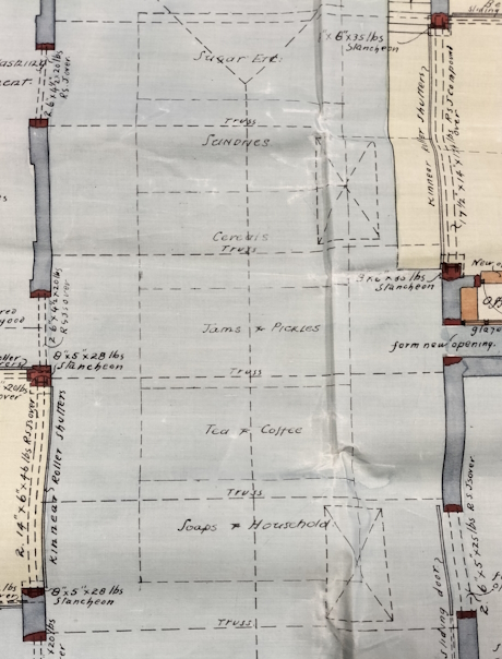Arguably more interesting is the detail which is found on the ground floor plan. There were areas for different products including Soaps/Household, Tea and Coffee, Jam and Pickle, Butter and Cheese and Bacon Hanging amidst others. Further plans were submitted in the following years for the ‘formation of an unloading dock’ and for a motor van store.
