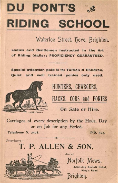 “Mr T. P. Allen, whose riding school in Waterloo Street, possesses a world-wide reputation, and who for many years has associated himself with all matters appertaining to the arts of riding and driving in Brighton, and whose name is said to be one of the most successful instructors in the town…
