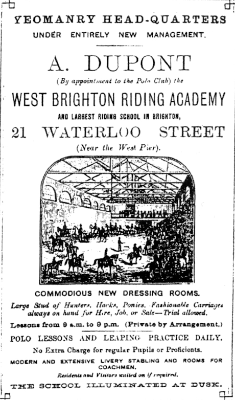Alfred Dupont takes over the Riding Academy in 1875, and it begins to be much better known and more prestigious. The first advert after Dupont takes over is from the 1878 Pages Directory and is full of information and considerable evidence of what we would now call ‘re-branding’. This advert is in sharp contrast with the discreet notice Frank Carter had placed a few years before. Here it is called the West Brighton Riding Academy and features a number of selling points: ”largest riding school”, “commodious new dressing rooms”, “illuminated at dusk “, not to mention the daily “leaping practice”. This is an interesting example of the power of advertising, a new concept in Victorian Britain. At this time, there were over 30 lodging houses in Waterloo Street alone and the advert may well have appealed to some of those visitors.