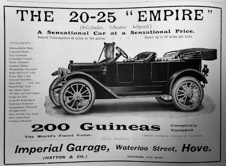 But change is on the way. Cars were replacing horses, at least for people who could afford them. This advert for “A Sensational car at a Sensational Price”, could be bought in a garage in Waterloo Street, is advertised in The Brighton Season just a couple of years later!