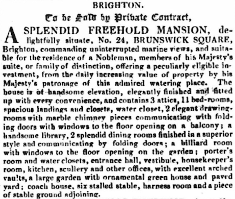 We first come across the house in a newspaper advertisement for sale in September 1830. It was built to appeal to “a nobleman” or “family of distinction” and was very well provisioned. There were 11 bedrooms, two drawing rooms, two dining rooms, a library, a billiard room, several water-closets etc as well as the necessary supporting facilities such as housekeeper’s room, kitchen, scullery and so on. The house had its own coach-house plus a six-stalled stable. Unusually, it also had “a large garden with ornamental greenhouse”.