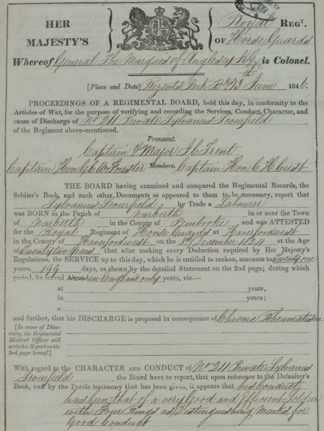 On 13 June 1846, Private Sylvanus Scourfield was discharged from the army due to chronic rheumatism. His conduct is described as being of a very good and efficient soldier with Four Rings and Distinguishing Marks for good conduct.