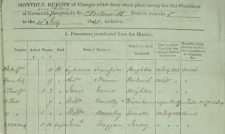 Sylvanus is recorded as being admitted as a permanent ‘Out Pensioner’ on 23rd June 1846 with an annual pension rate of 11d. Initially he is recorded as being in London but the ‘Monthly Return for changes which took place for out pensioners’ for the ‘period 1st to 31st July 1848’ he is recorded as transferring from ‘Greenwich and Chelsea Hospital in the 1st Portsmouth District’ to Brighton; Chelsea is handwritten next to Greenwich, so this is an adapted document with Sylvanus actually transferring from London.