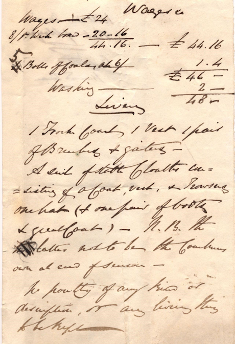 One such contract I found included these minute details '1 frock coat, 1 vest, 1 pair breeches & gaiters – a suit of stable clothes consisting of a coat, vest & trousers, one hat (& one pair of boots & greatcoat) NB the latter not to be the coachman’s own at end of season - no poultry of any kind or description, or any living thing to be kept’.