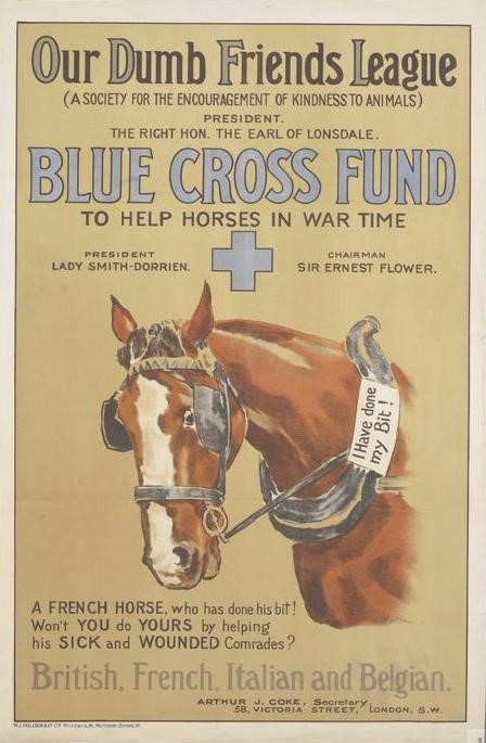 The 20 years from the mid-1890s until the start of the First World War must have been worrying times for anyone involved with horses and stable life. In 1914, at the outbreak of war, many horses in Brighton, like elsewhere in Britain, were requisitioned by the military for war service. The British Army needed thousands of horses for cavalry, transport and artillery, leading to widespread seizures of privately owned and working horses. Of these, only around a quarter were returned after the war. It was during the wars of this time, the Balkan and WW1, that The Blue Cross Fund was launched as a branch of Our Dumb Friends League in 1912. Their aim was to provide veterinary care to the horses and other animals used in the conflicts, working alongside the Army Veterinary Corp.