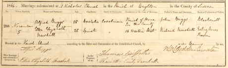 Interestingly, his father Richard’s occupation is given as Blacksmith which may give some clue as to Alfred’s familiarity with horses. His wife Ellen is the daughter of Richard Marshall, described as an Eating-House Keeper of 16 Western Street, Brighton. Richard Marshall has previous connections himself to Brunswick Square appearing in the 1841 census as a manservant at 28 Brunswick Square. At the 1861 Census Alfred Briggs is single and appears to be at 13 Brunswick Street West with his occupation given as Coachman.