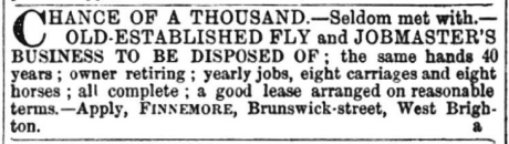 At the time of the 1881 census, Thomas gives his occupation as Flyman. Boarding with them is his 22-year-old sister Eliza Lake who is also described as a Flyman. When Thomas married Martha (nee Ayre) at St Andrews Church, Hove on 3rd December 1879 he gave his profession as Fly Proprietor. This suggests that by at least 1881 if not before, 46 Brunswick Street West was occupied by an independent coaching business without affiliation to any property in the main square.