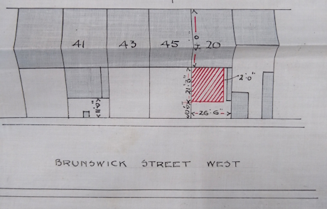 Development plans of 1924 show the location of 20 Brunswick Street West which would have been opposite the garden of 41 Brunswick Square, now 43 Brunswick Street West. The plans show that the later 19th-century developers of that side of the street were somewhat creative in their numbering.