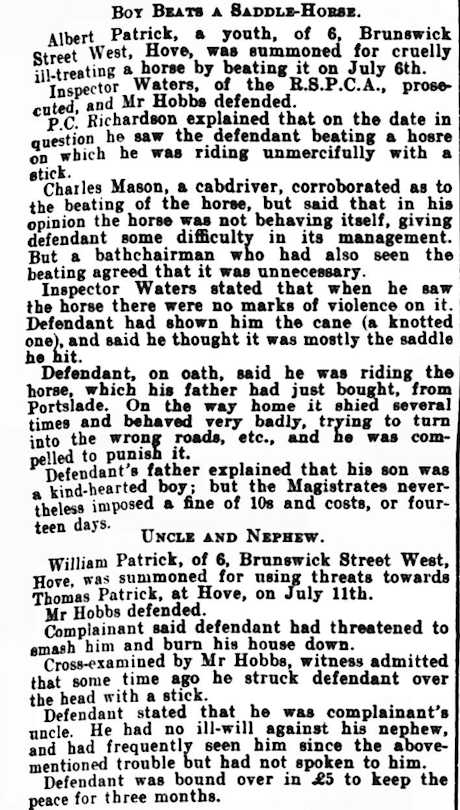 Returning to our property, No 20 appears to have been used on leasehold by 'jobmasters' Thomas Patrick and his uncles, William Patrick and Alfred Patrick from 1896 onwards. A jobmaster was a keeper of a livery stable who rented out horses and carriages by the week or month. The Patricks were a family of two brothers and a sister (William, Alfred and Ellen) who had moved from Hundon, Suffolk to Brunswick Town with a jobmasters business at 6 Brunswick Street West and another at Lansdowne Mews.