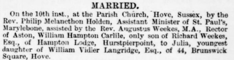 The incoming family in the main house between 1856 and 1861 were the Langridges. William Vidler Langridge was Clerk of Peace for Sussex. With a wife Isabella Langridge and a daughter Isabella Sophia Langridge , aged 21 still living at home and an entourage of servants, you would expect he had a need for transport. and it can only be assumed the stable staff were just not recorded in the 1861 Census at either address or that he hired his transport from another source. The latter seems unlikely with his busy professional and consequent social life. How negligent of a Clerk of the Peace to not record his staff it seems! The wedding of another daughter Julia Langridge to William Hampton Carlisle at Hove Parish Church in October 1860 would surely have necessitated numerous carriages.