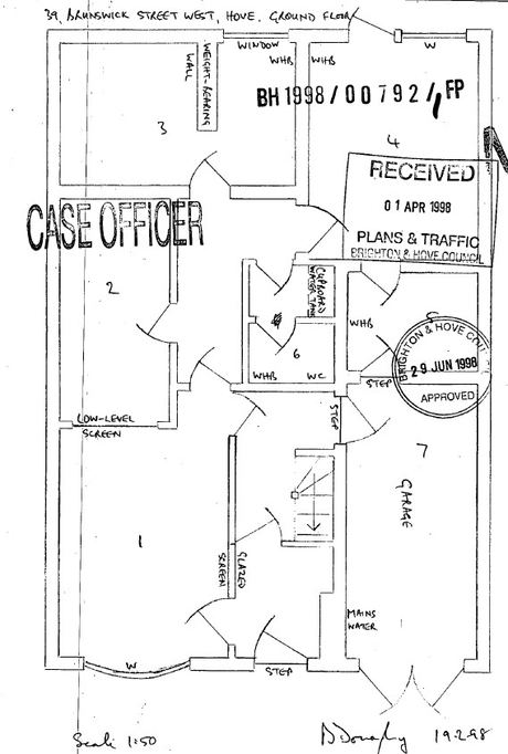 To give you some idea of the internal size of this humble building using a fairly recent planning application, I would estimate a total floor area of over 2000 square feet divided equally between the two floors This is quite substantial when compared to that of a modern two-bedroom flat averaging at 800 sq ft. Unfortunately, the modern plan now shows a large upstairs flat belonging to 44 Brunswick Square leaving only 344 sq ft to No 39 on the first floor but I speculate that this is a recent alteration.