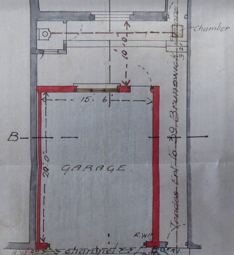 In 1921, permission was granted for a motor garage to be built at No. 39 Brunswick Street West. Following the 1925 renumbering No. 39 became No. 49 Brunswick Street West. This is confirmed from a record in the Keep which shows an auction in November 1929 of “No. 39 Brunswick Square together with a garage at No. 49 Brunswick Street West”.