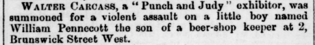 The incident took place in Waterloo Street when a group of boys harassed Walter Carcass who attempted to kick one of the boys but instead kicked William Pennicott. Although he denied the kick was intended to cause harm he was fined 10s with a default on payment resulting in two weeks committal. Walter Carcass’s two oldest sons, Walter and Philip, were also Punch and Judy exhibitors. The Eastbourne Gazette 13th March 1878 reported on a case at Brighton Borough Bench where Walter Carcass was charged with assault (it is not clear if this was father or son). The police superintendent stated that ‘he and his family were well known to the police as a ruffianly set, and were no strangers to the Bench’. He was sentenced to one month’s imprisonment with hard labour. Walter Carcass jnr. became a travelling exhibitor and multiple newspaper reports suggest a turbulent and troublesome life. The second son Philip remained in Brighton and became ‘Professor P Carcass’ operating a Punch & Judy stall until his death in 1938.