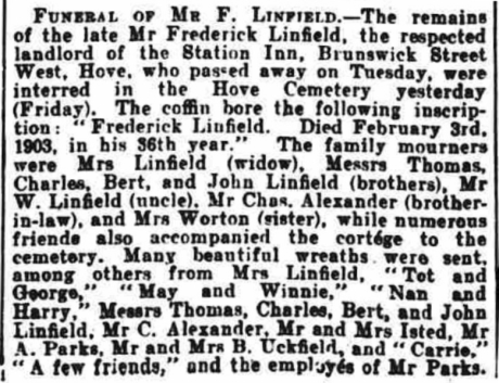 The tenure of Frederick Linfield as landlord ended in 1903. Dying at the age 35 his funeral is reported in the Brighton Gazette on 7th February 1903. From 1903 his wife Elizabeth Louisa is listed as the landlady of the Station Inn until she is sadly recorded as dying at the age of 35 in March 1910.